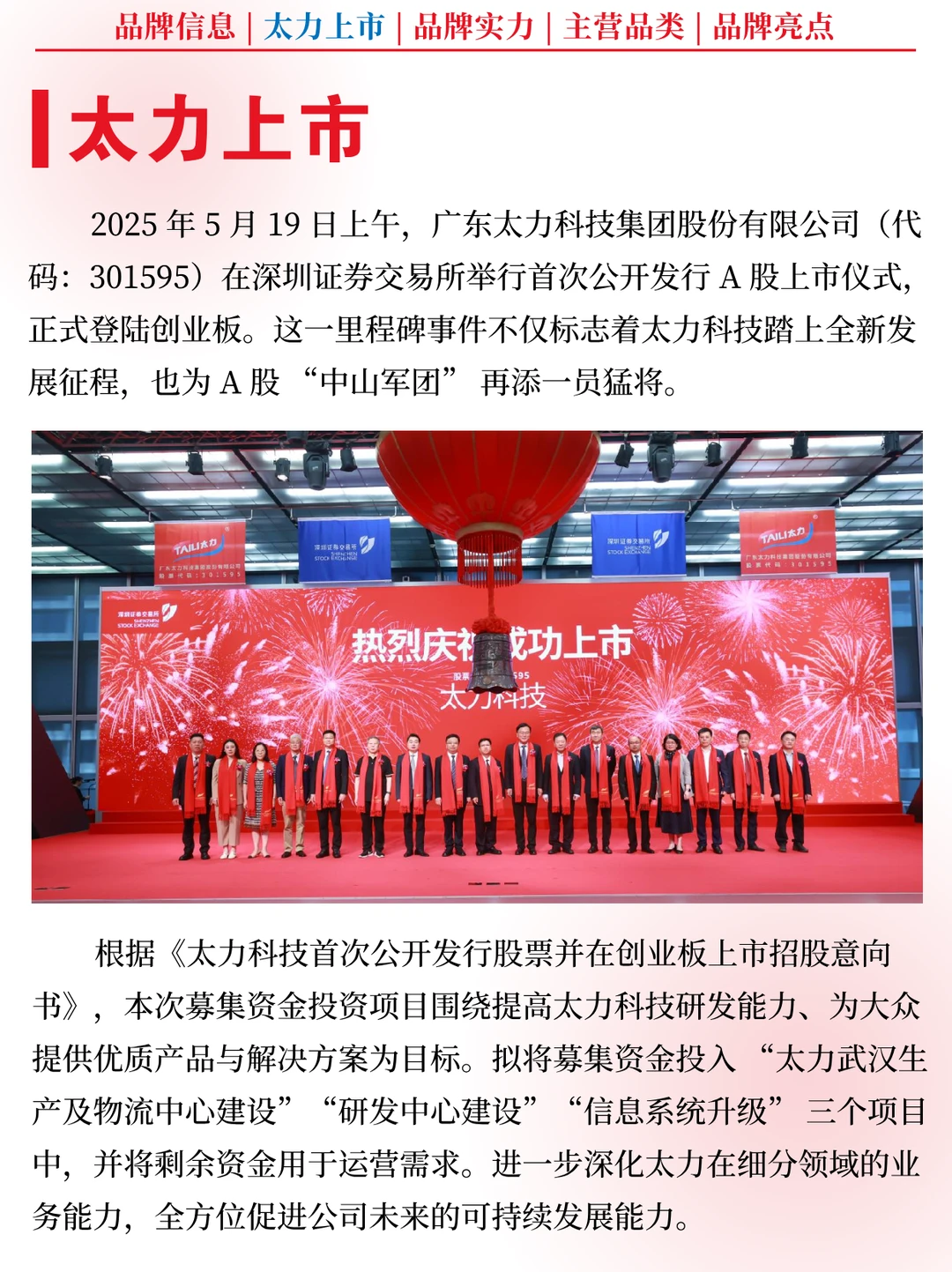 [烟花R] 2025 年 5 月 19 日上午,广东太力科技集团股份有限公司(代码:301595)在深圳证券交易所举行首次公开发行 A 股上市仪式,正式登陆创业板。这一里程碑事件不仅标志着太力科技踏上全新发展征程,也为 A 股 “中山军团” 再添一员猛将。