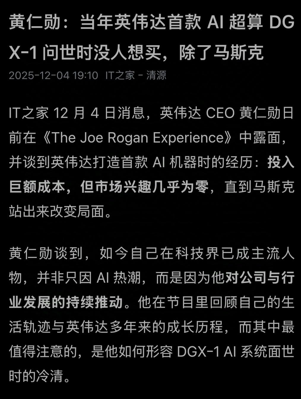 OpenAI 与马斯克的决裂,总是比人情变化更快。 马斯克当年买下 DGX-1,不只是为了玩模型, 他是在用行动告诉世界:“AI 不是玩具,是未来的引擎。” 而随着 OpenAI 越做越大、商业化越深入、利益越复杂, 那个曾经愿意为它承担风险、投入资源的人,反而被排除在外。 这既是时代的无情,也是资本逻辑的冷酷。 但有一点不可否认—— 如果没有最初那一台 DGX-1 的选择, 也许整个 AI 行业的进度条都会往后拖好几年。 科技史上,真正推动时代前进的往往不是巨头,而是那些“敢在没人看好的时候下注的人”。 愿我们在自己的领域,也能保持这种勇气: 在低谷中坚持,在沉默中前行,在未来还没到来时,就敢相信它。