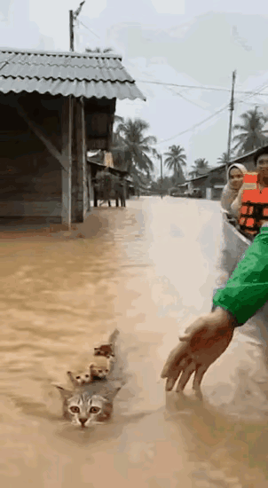 洪水滔天里,猫妈妈背着3只崽踩水求生!人类伸援手的瞬间看哭了 浑浊的洪水漫过