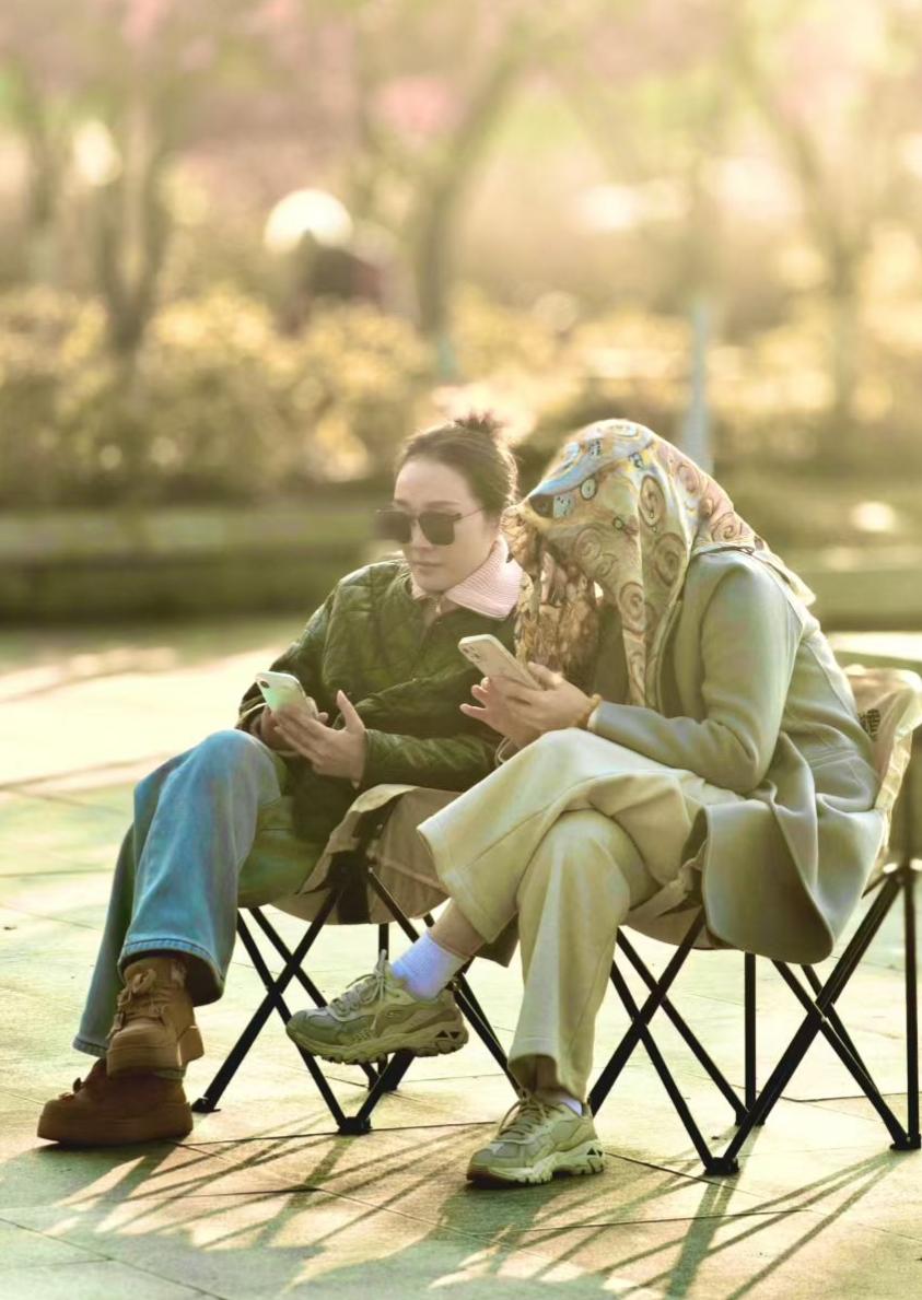 阳光把影子揉得软软的,两人各捧半寸屏幕,风裹着春的暖,把闲聊的碎语都晒得发甜。连头巾都裹着慵懒,日子慢成椅边晃悠的光斑。