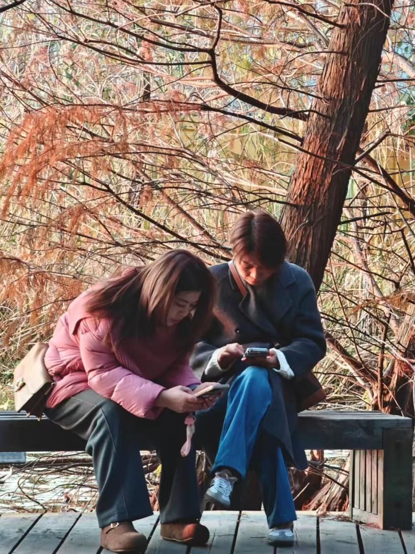 阳光把影子揉得软软的,两人各捧半寸屏幕,风裹着春的暖,把闲聊的碎语都晒得发甜。连