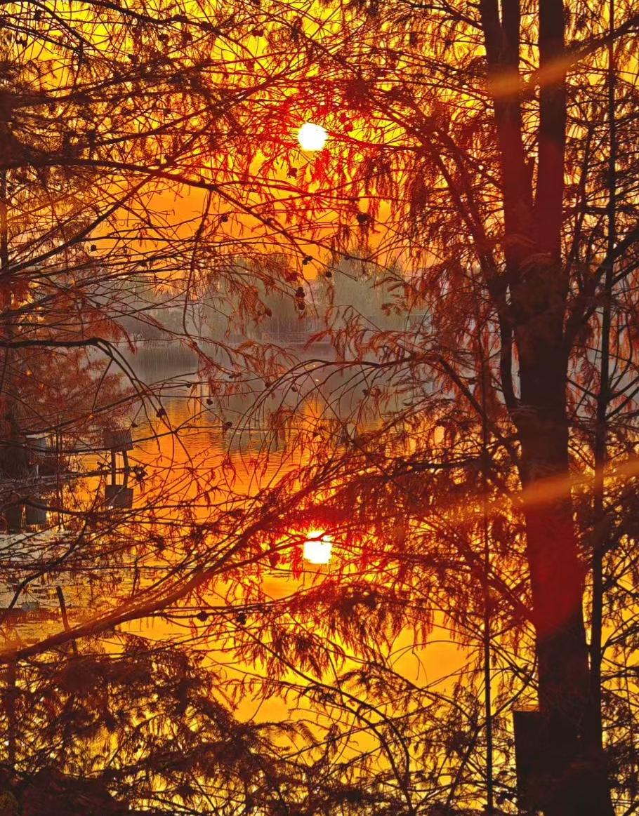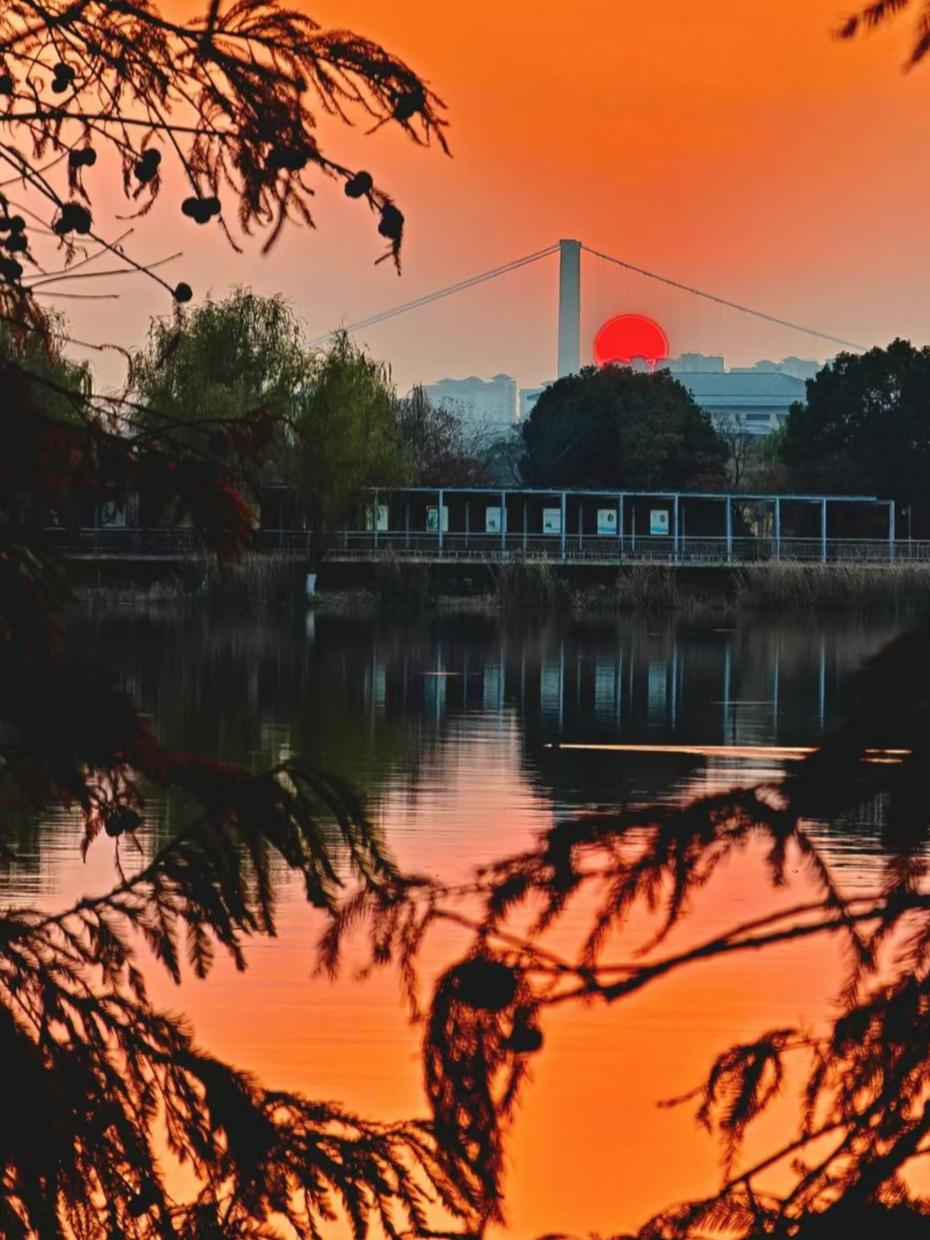 晚风把落日揉进湖面,枝桠牵着碎金摇晃,连空气都浸成了暖橘色的糖。 落日把桥杆作了画框,把自己嵌成一捧暖红,揉碎在湖面的波纹里,连枝桠都染成了温柔的剪影。