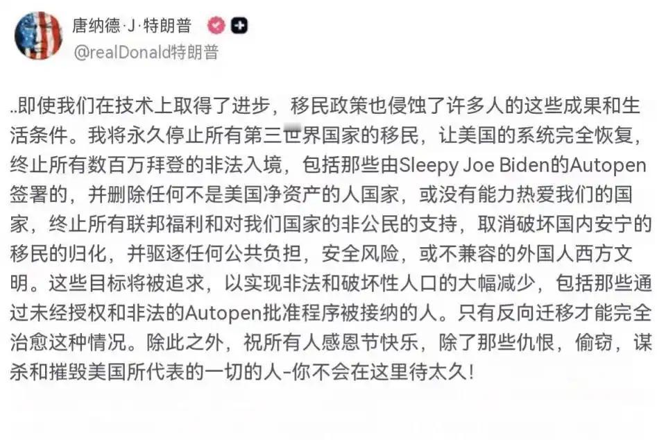 继美国总统特朗普宣称将永久暂停来自所有“第三世界国家”的移民之后,特朗普再次对移民进行攻击,将索马里移民称为“垃圾”,但是得到了盟友和支持者的称赞。特朗普为何如此攻击移民,真的只是为了美国的稳定吗? 2025年11月发生在华盛顿的一起袭击案,让原本就紧绷的移民议题彻底引爆。 11月26日傍晚,白宫周边几个街区外传来枪声,两名执行巡逻任务的国民警卫队士兵应声倒地。 后续调查显示,被捕的袭击者是2021年通过相关安置计划从阿富汗进入美国的移民,这个身份标签迅速被政治力量捕捉。 美国总统特朗普当晚就召开紧急会议,不仅宣布全面冻结阿富汗公民的移民申请,还紧急调派500名士兵进驻华盛顿加强戒备。 这场个案处理并未止步于治安应对,反而成为政策扩容的起点。 11月27号,特朗普在个人社交账号发布长文称,将永久暂停所有“第三世界国家”的移民。 文中明确划定移民准入红线,要求申请者必须能“为美国创造正向价值”,否则将被纳入“清理范围”。 方案还附带一系列强硬条款,包括停发所有非本国公民的联邦福利补贴,对“危害社会稳定”的移民启动国籍撤销程序。 这个“第三国家”的概念,指的是亚洲、非洲、拉丁美洲在战后以来获得民族解放和国家独立的发展中国家。 在政策框架抛出后,特朗普的公开表态开始转向具体群体,言辞烈度不断攀升。 12月2日,一场对媒体开放的内阁工作会议上,有官员汇报明尼苏达州索马里裔群体涉及的公共福利欺诈调查。 特朗普听到后突然打断发言,用极具侮辱性的词汇形容当地移民群体,称这类人“不配留在这片土地”,应当全部送回原居地。 3日,他在接受采访时进一步加码,将索马里描述为“全球最失败的国度”,声称其移民群体“正在侵蚀美国的根基”。 他还将批评矛头对准出生于索马里的联邦议员,同时指责明尼苏达州地方政府对移民问题“放任不管”。 口头抨击的同时,联邦层面的执行措施迅速跟进。 美国公民及移民服务局当天就发布公告,宣布对19个“重点关注国家”的现有绿卡持有者启动全面复核,公告中明确将“来源国整体状况”列为审核的“关键负面参考项”。 与此同时,全国范围的专项搜捕行动同步展开,身着制服、佩戴面罩的联邦执法人员重点排查“外貌符合拉美裔特征或使用西班牙语”的群体。 这样的言行自然引发了轩然大波,但各方的反应却泾渭分明。 明尼苏达州的官员们第一个站出来反对,州长沃尔兹说特朗普是在“无证据妖魔化整个社区”,明尼阿波利斯市长干脆宣布,当地警方绝不配合联邦的移民搜捕。 圣保罗市长更是直接说攻击索马里裔移民,本质上就是攻击“美国人”,要知道,明尼苏达州7.6万索马里裔里,超过一半都是在美国出生的。 与反对声浪相对的是,特朗普的强硬立场在其政治同盟和核心支持者中获得强烈共鸣。 副总统万斯在会议上,当场以敲击桌面的动作表达认同,这一细节被镜头记录后迅速传播。 白宫新闻秘书在后续记者会上更是盛赞特朗普的表态“极具历史意义”,称其“勇敢点出了长期被回避的问题”。 共和党籍国会议员虽多数未公开表态,但这种集体沉默被解读为默认支持。 之前特朗普将部分非洲国家称为“劣等国度”,还曾遭到党内部分议员批评,本人也被迫出面澄清,可以看出此次党内态度的转变十分明显。 一名共和党策略师私下透露,将社会问题归咎于外来群体,是凝聚支持者最直接的办法。 仔细想想,特朗普的用意再明显不过,美国当下的社会矛盾不少,经济压力、阶层分化,这些问题盘根错节,解决起来难度极大。 但如果树立起一个共同的“敌人”,把所有矛盾都归结到“第三世界”移民身上,情况就不一样了。 他反复强调移民“依赖福利”“带来安全风险”“毁掉美国”,就是要让选民相信,自己的困境都是这些外来者造成的。 只要大家都对着这个“敌人”,原本分散的不满就会集中起来,支持者自然也就团结了。 这种逻辑背后,也戳破了美国“移民国家自由平等”的神话,这个所谓的自由平等,从来就没真正给过“第三世界”的移民。 从最初的19个“受关注国家”,到后来把整个“第三世界”都圈进去,连印度、中国这样的国家也没放过,本质上就是用出身给人贴标签,搞区别对待。 尽管有不少批判的声音,但对特朗普来说,这步棋走得很值。 移民议题从来都是他的政治杠杆,哪怕整体支持率下滑,只要能靠这个议题激活核心支持者,把摇摆选民的注意力转移到排外上,就能巩固自己的政治基本盘。 至于那些被伤害的少数族裔权益,那些被冲击的国家信誉,甚至美国作为移民国家的立国根基,在他的政治算计里,显然都得往后排。 制造一个敌人,远比解决一堆复杂的社会问题,要简单得多,也有效得多。