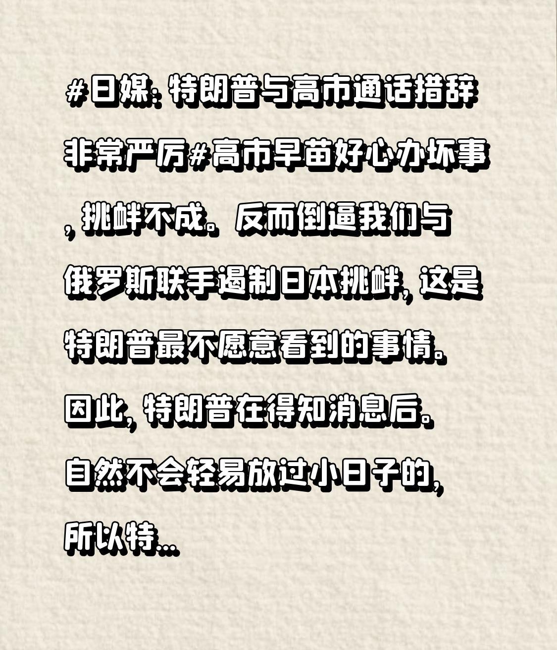因此,特朗普在得知消息后。自然不会轻易放过小日子的,所以特朗普措辞严厉就可以理解了。 人家特朗普本来就是让高市早苗搞事情,而不是做好事的。 如今我们与俄罗斯联手遏制日本挑衅,你让特朗普怎么办?专家:日本误判形势必引火烧身 日本民众为何反对高市早苗的涉台言论 日本的军事扩张是否会影响地区和平