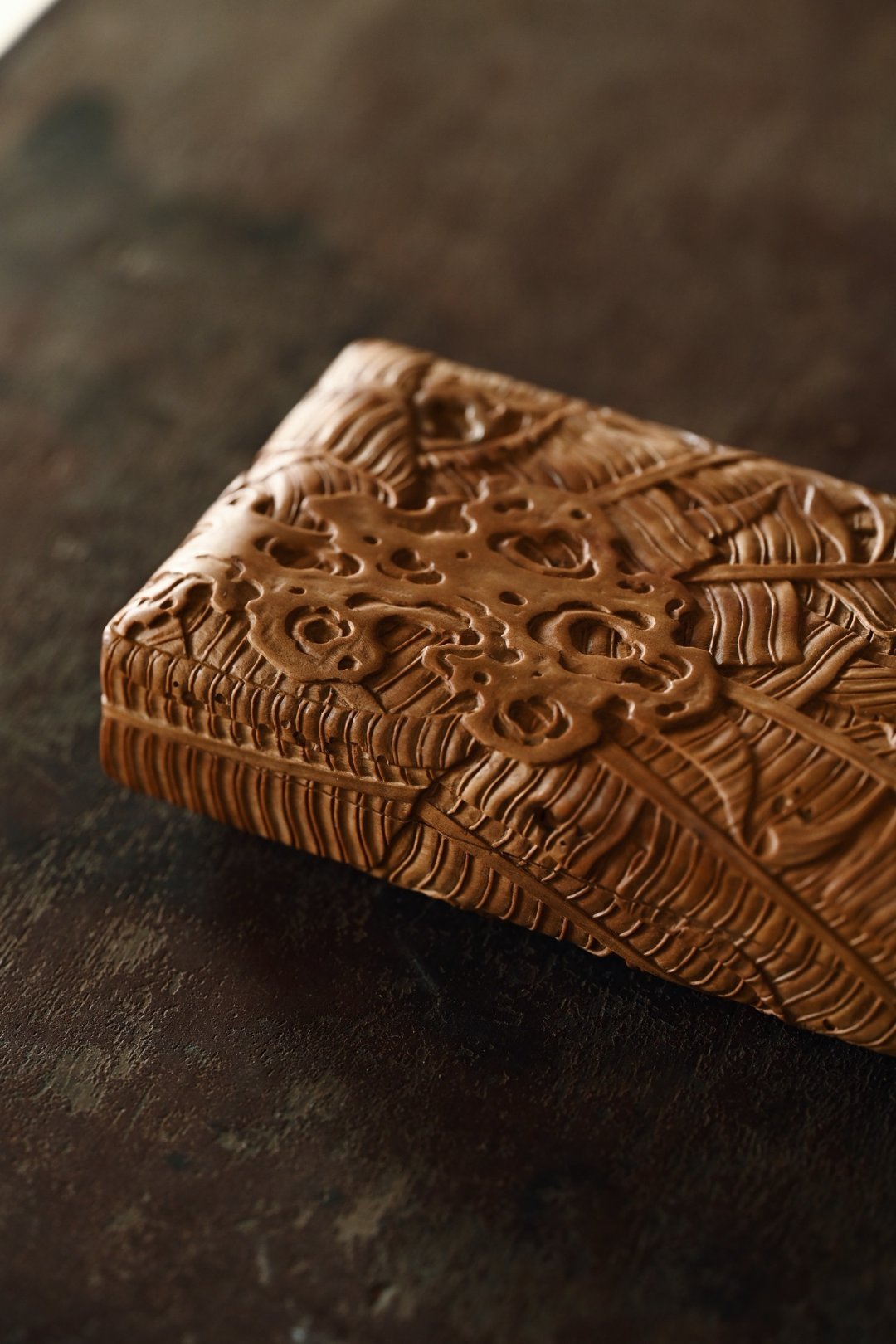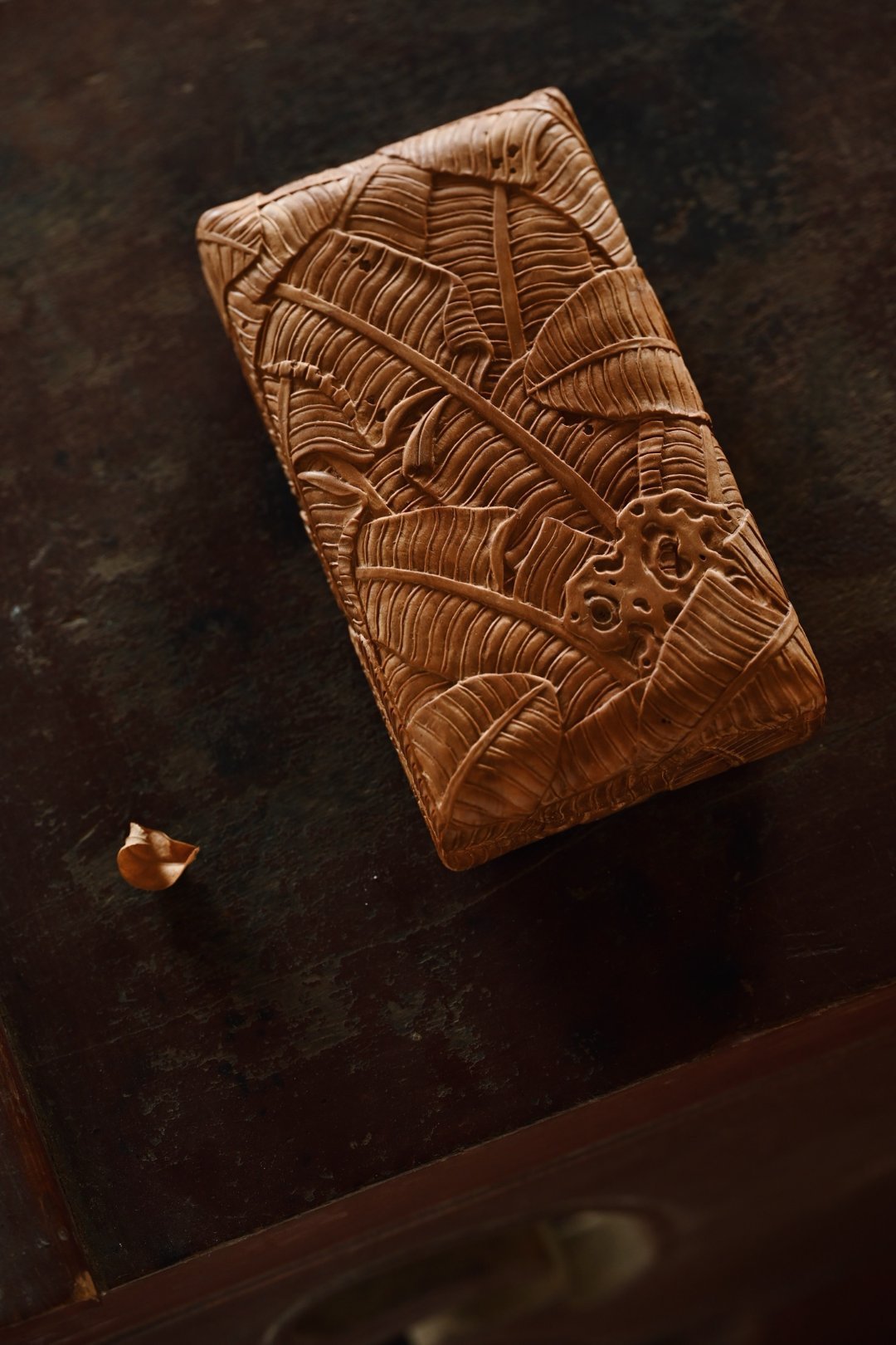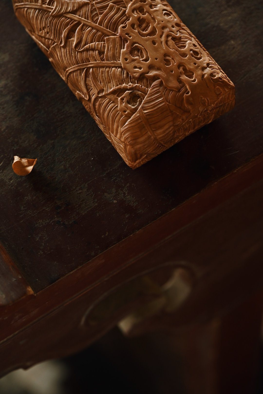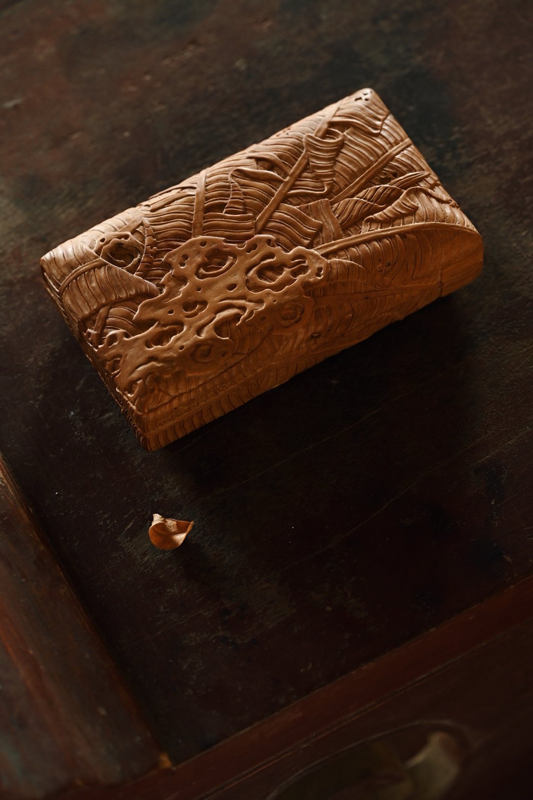 老山檀 | 湖石蕉叶 收纳盒整料掏空而制,雕刻芭蕉婆娑,蕉叶阔大,错落有致,或藏或露,疏影横斜,湖石具透漏之态,存物取用间意趣横生。14*8*4cm 200g