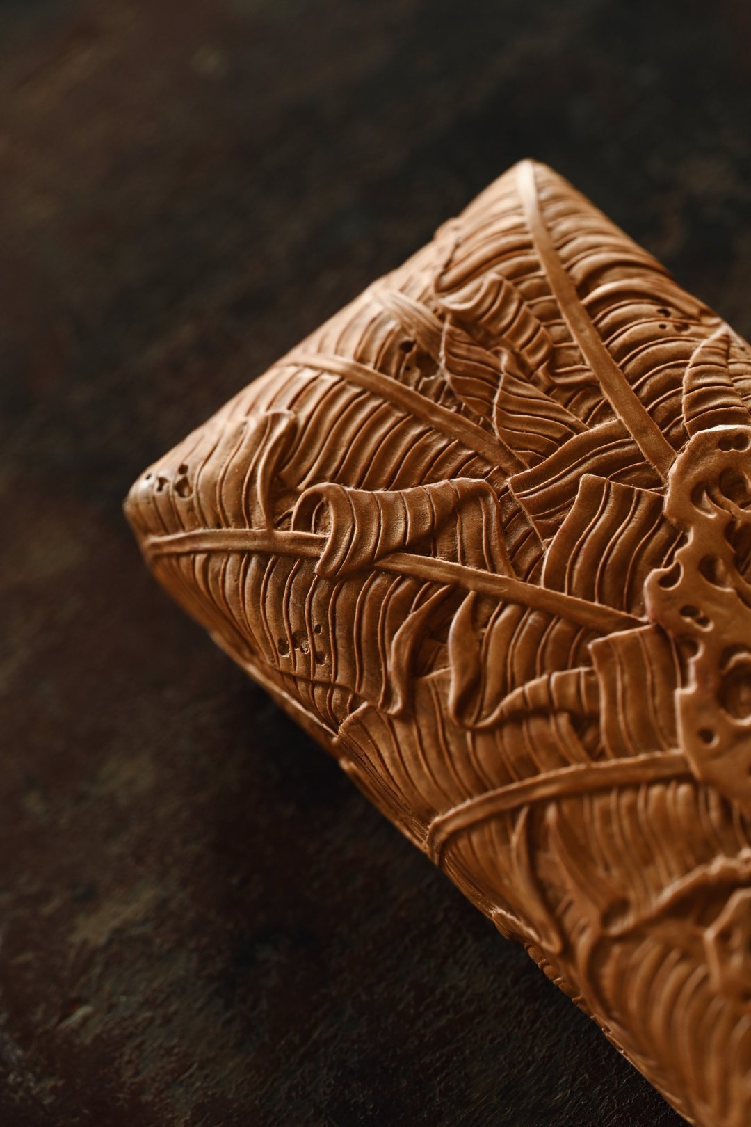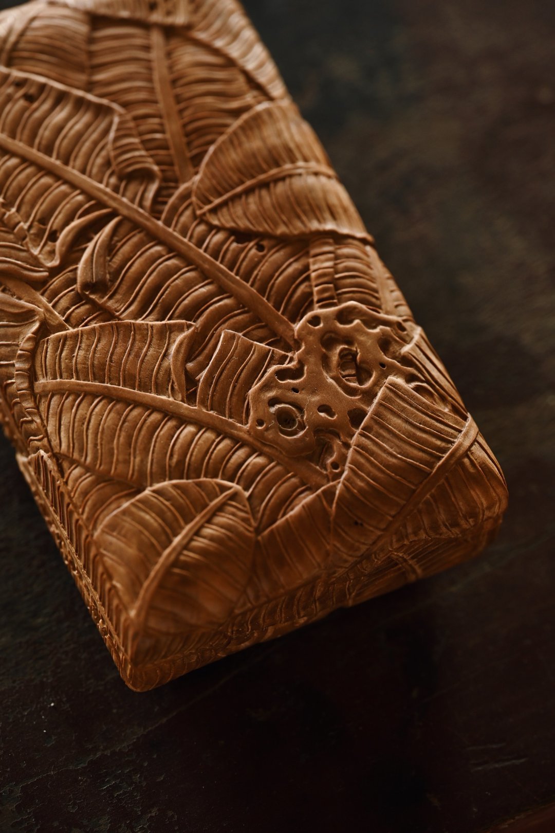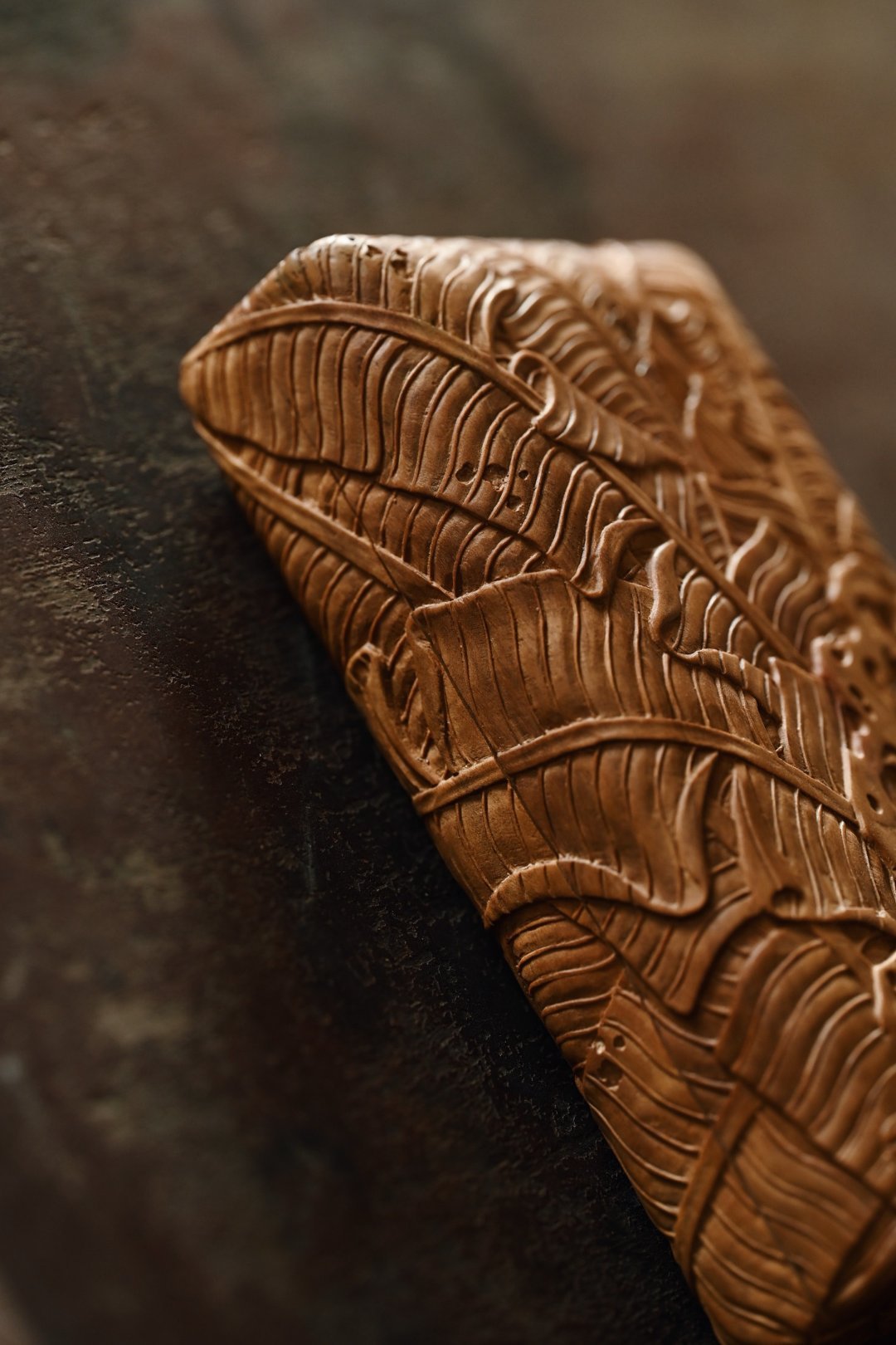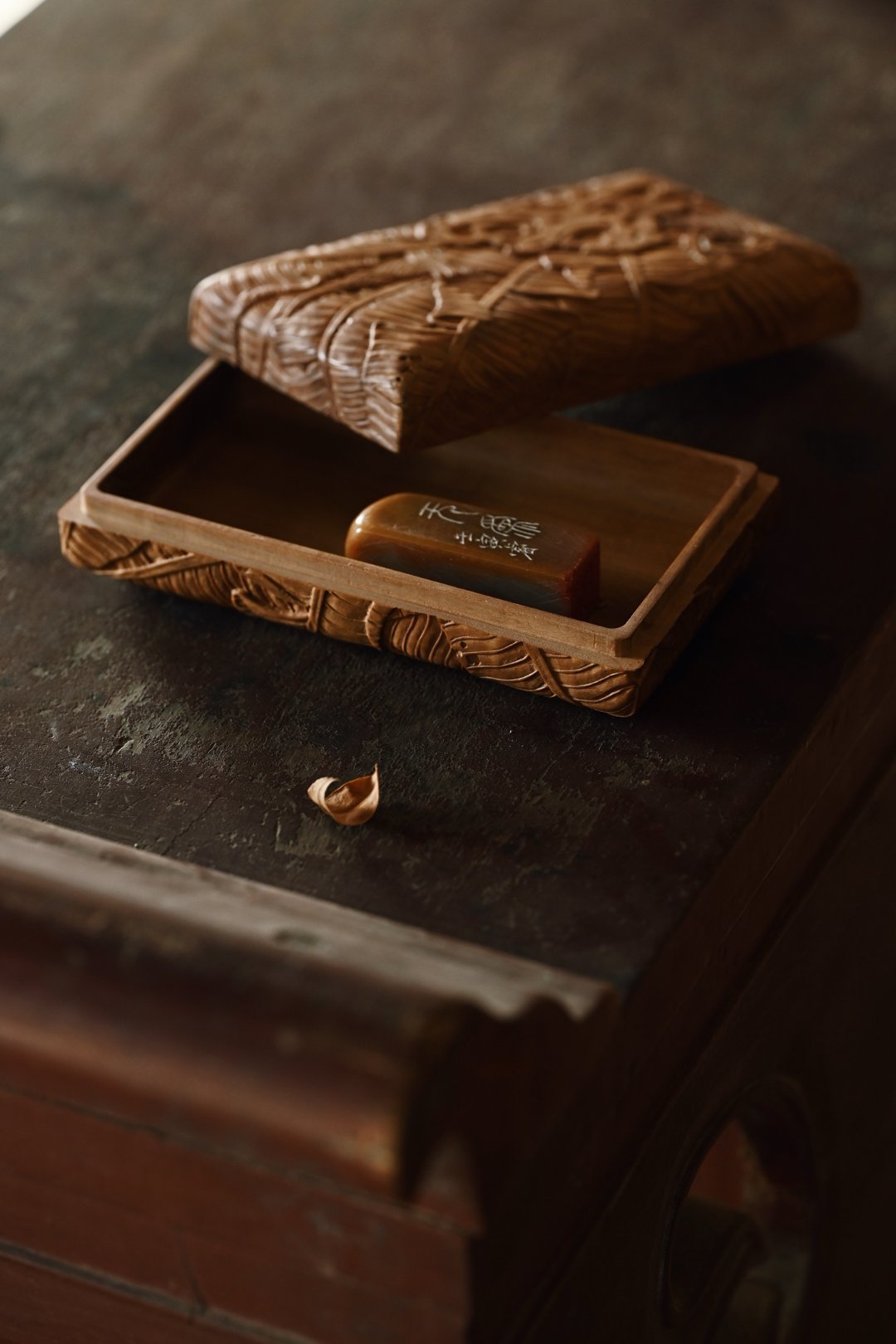 老山檀 | 湖石蕉叶 收纳盒整料掏空而制,雕刻芭蕉婆娑,蕉叶阔大,错落有致,或藏或露,疏影横斜,湖石具透漏之态,存物取用间意趣横生。14*8*4cm 200g