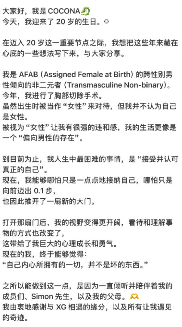 【Theqoo】在20岁之际宣布自己是跨性别男性倾向的非二元性别者,并做了胸部切除手术的XG Cocona,OMG好勇敢cocona秋山心响