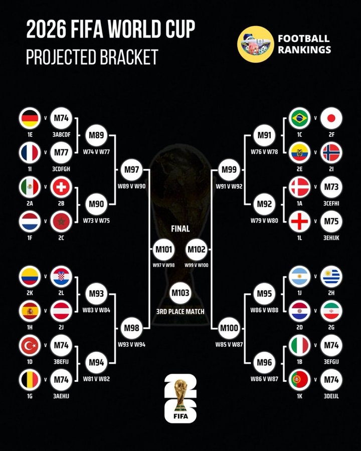直播吧12月06日讯2026世界杯抽签结束,结合此前公布的签位表,淘汰赛潜在对阵随之出炉。