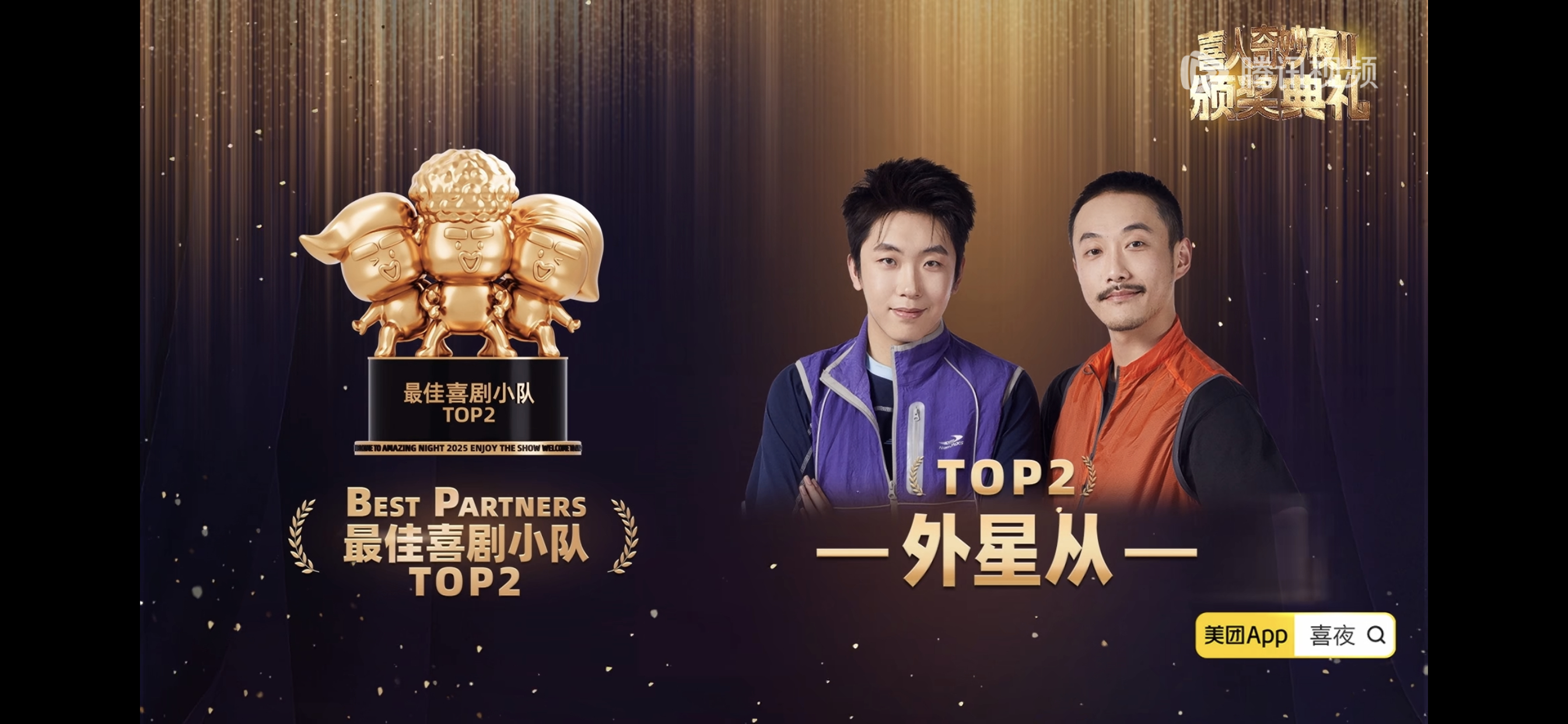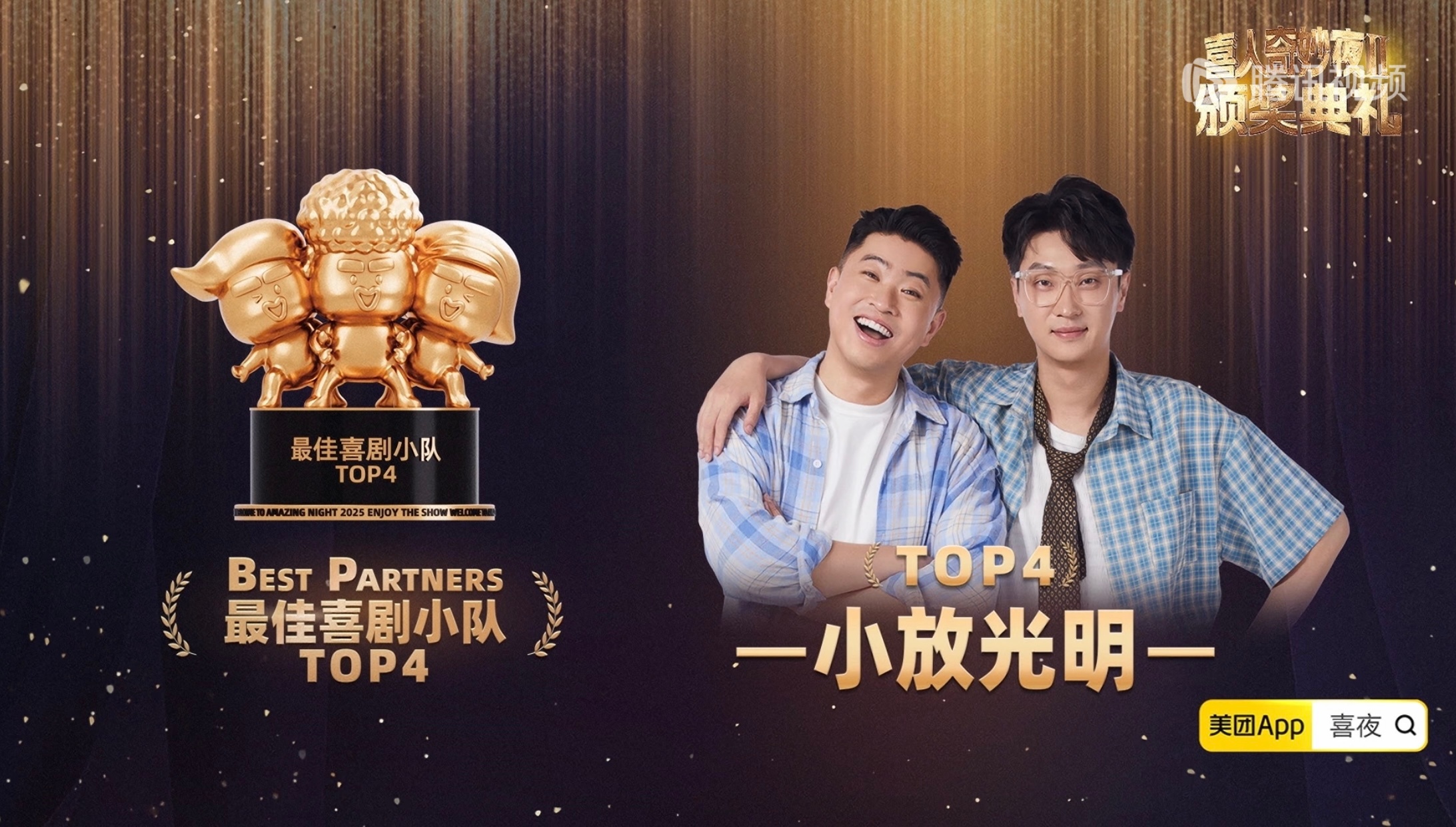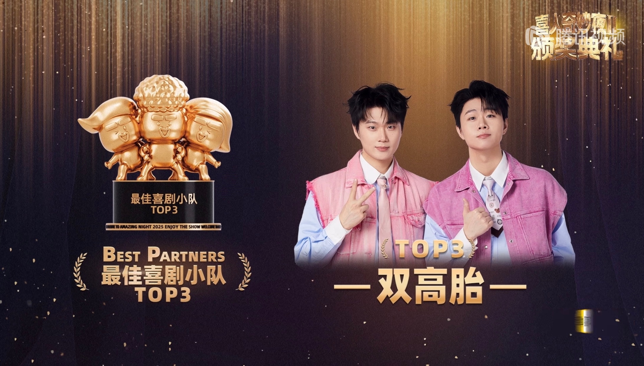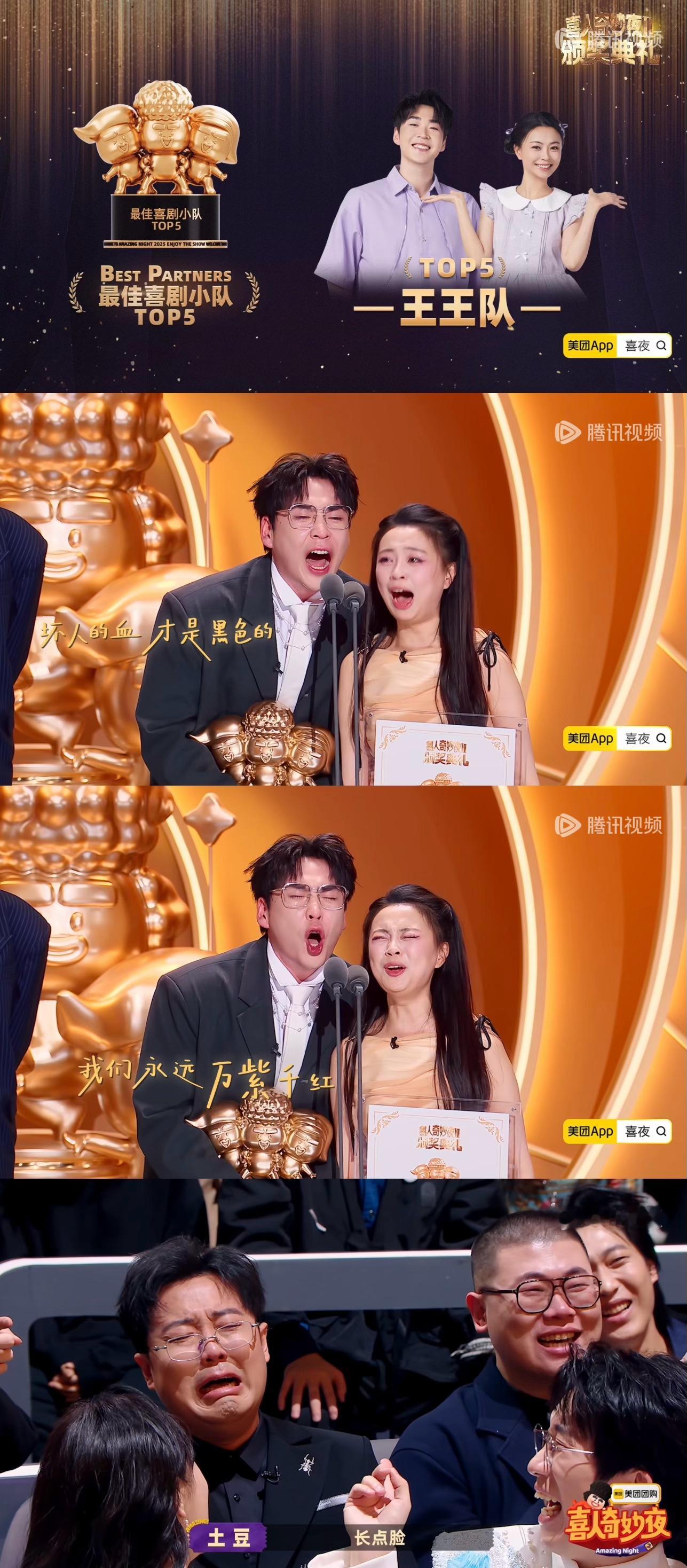 毕业快乐值得的都值得,好作品和快乐我会一直盘下去传播至于永恒的最受观众喜爱喜人:张兴朝、张呈、高越最受观众喜爱作品:《技能五子棋》《救舅大状师》最佳喜剧编剧:刘同行业瞩目作品:《夜宴》《一颗螺丝钉》行业瞩目喜人:高海宝、李梓溪、杨雨光最佳喜剧小队top5:王王队、top4:小放光明、top3:双高胎、top2:外星从、top1:小力士冠军喜团:五花八门喜团总分《乐园停业那一天》14600十人部落:111600+14600×3=155400《羊来咯》14300八仙子:111600+14300×3=154500《花园网吧》15000五花八门:110800+15000×3=155800《再见噶尔波》14300Okboom:107800+14300×3=150700喜人奇妙夜
