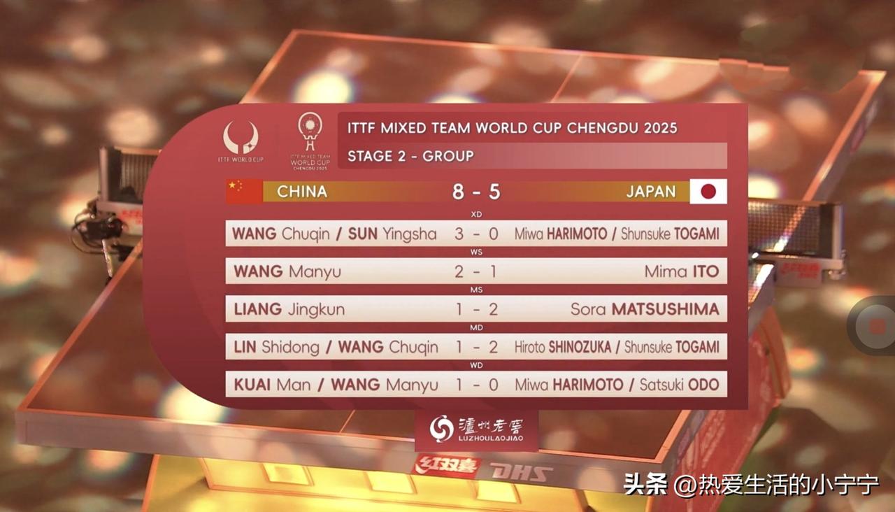 今天中午这比赛打的太激烈,太刺激。心脏不好的看不了啊。 恭喜中国队取得胜利的同时,也看到了日本队飞速的成长,已经完全有实力和我们掰掰手腕。 或许以前总在喊狼来了,狼来了。而现在,狼真的来了。 说一下结果,总分8:5。 第1局:王楚钦/孙颖莎3:0上隼辅/张本美和。这一场球用4个字来形容吧:兵不血刃。“莎头组合”不愧是奥运冠军,“世一”的存在,整体实力上完全碾压。日本队这边,张本美和对上隼辅的表现不太满意,从表情上能看出来。不知道日本教练是雪藏张本智和,还是有其他想法?为什么不上张本兄妹组合? 第2局:王曼昱2:1伊藤美诚。曼昱的肩伤又复发了,否则这场球应该是个3:0。伊藤美诚依旧还是搏杀式的打法,打得很凶,当然失误也是较多。 第3局:梁靖昆1:2松岛辉空。两个人水平差不多,正常化五五开。梁今天的状态有点低沉。松岛这两年球“涨”得很快,在日本队的地位和张本智和不相上下。 第4局:王楚钦/林诗栋1:2上隼辅/篠塚大登。如果能为这场球找一个输的借口,那就是王楚钦太累了。 第5局:王曼昱/蒯曼1:0张本美和/大藤沙月。“双曼”组合,在乒乓球女双这个领域里,还是独一档的存在。放眼当今乒坛,还是没有对手的。