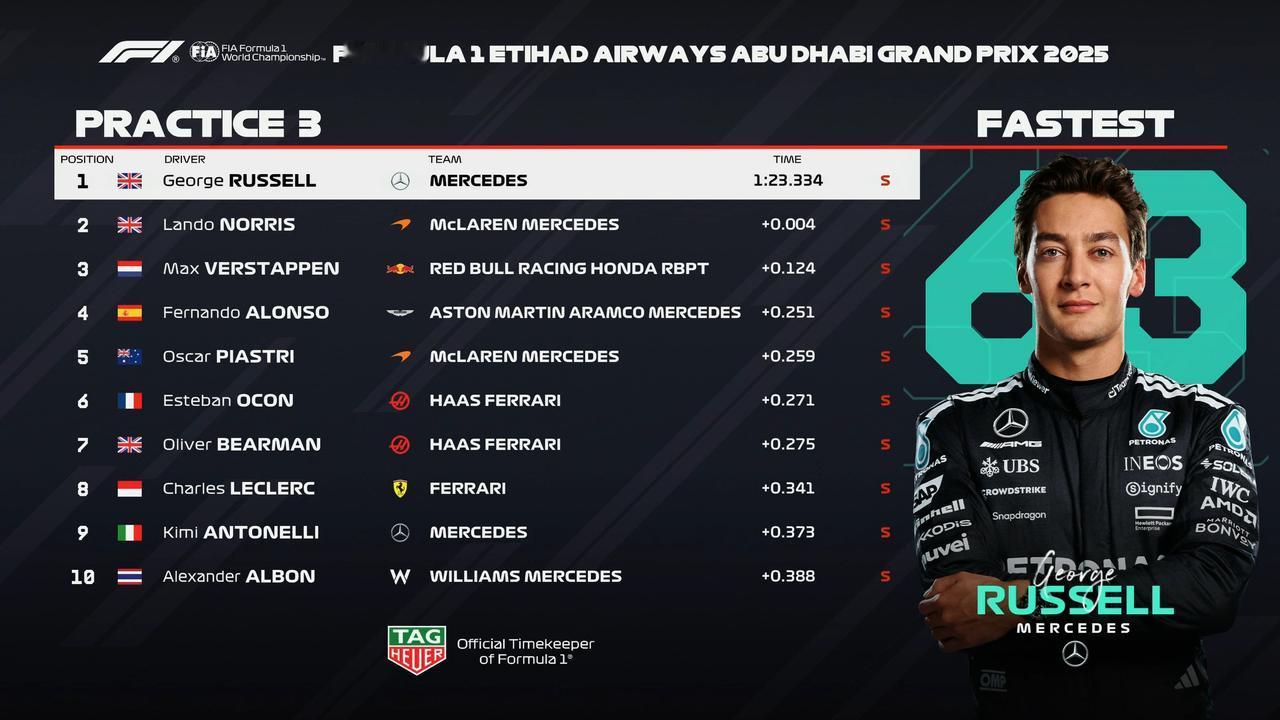 三练结束,拉塞尔第一! 拉塞尔如果能在排位赛和正赛里「持续乱入」的话,诺里斯站上领奖台的可能性也随之降低,那WDC就…… 汉密尔顿在撞墙之后的TR里说,应该是赛车哪儿先出现问题了,所以车尾丢失了下压力; 梅奔在P区里,给安东内利造了一个不安全释放,把角田侧箱撞坏了。 这一场戏少不了,晚上22:00排位赛继续!【来自懂车帝车友圈】