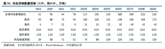 风力发电主要用铜环节为发电机、变压器、电缆、齿轮箱和塔筒电缆等。陆上风机通过集电器电缆相连至变电站后,再连接到电气和输电网。海上风机通过集电器电缆相连至海上升压站后,通过配电电缆连接至地面变压站,再到输电网络。据WoodMackenzie数据显示,陆上风电每GW装机需要耗铜0.54万吨,海上风电每GW装机需要耗铜1.53万吨。根据全球风能理事会(GWEC)发布的《2025全球风能报告》,风电行业需将其年新增装机从2023年的117GW提高到2030年的至少215GW,据此测算,2025年全球风电领域用铜数量达109万吨,占全球铜消费的3.3%。鉴于风电仍保持增长,预计2025-2028年风电领域用铜增长分别为19万吨、9万吨、12万吨、5万吨。