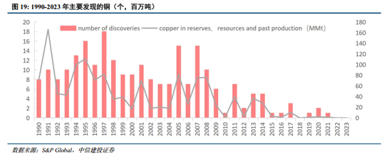 发现矿山数量少,潜在的可供开发项目数量有限。根据S&PGlobalCommodityInsights2024年度更新报告,确定了1990年至2023年发现的239个铜矿矿床,过去2014-2023十年的新发现仅占14个,占总数的5.9%。239个铜矿合计的储量、资源量和过去的累计生产量共计13.15亿吨铜,这一数量较去年增加了4%,即6100万吨。但是,其中大部分增长是由于较旧发现的矿床的扩张,1990年代发现的矿床占总增长的70%,即4300万吨。过去十年新发现的14个铜矿所含体积仅占自1990年以来主要发现的所有铜的4620万吨,即3.5%。由于新资产自然需要更多时间来开发,因此这一数量在未来几年内可能会增加,从而有资格成为重大发现。然而,最近的发现在规模或数量上肯定无法与1990年代相提并论,换而言之,未来供铜矿商备选开发的项目有限。