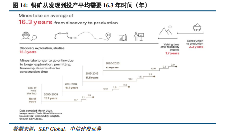 新建矿山从首次发现矿藏到最终实现生产,是极其漫长且日益艰难的过程:勘探与可研、审批与等待、建设与投产。根据S&PGlobal数据,勘探与研究阶段是最最耗时的环节,平均长达12.3年,包括初步发现、详细勘探、资源评估以及可行性研究,以确认项目的经济和技术可行性。审批与等待阶段,在完成可行性研究后,项目并非立即动工,而是需要平均1.7年的时间用于获取政府许可、社区许可以及完成最终投资决策等。所有条件具备,实际的矿山建设到产出产品相对较快,平均需要2.3年。