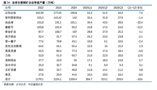 2025年前三季度全球主要铜矿企业产量下降10.6万吨。全球主要铜矿企业已相继公布2025年前三季度经营数据,14家铜矿企业的产量加总911.7万吨,同比减少10.6万吨。其中,减量较为明显的是自由港、嘉能可、英美资源,自由港由于印尼冶炼关停及尚未获批铜矿出口,后又遭遇地下泥石流中断生产;嘉能可由于Collahuasi、Antapaccay和KCC的矿石开采率、原矿品位和总体回收率降低;英美资源则由于智利矿山品位及选矿维护问题造成减量。增量明显的是力拓、五矿,分别受益于OyuTolgoiUnderground、LasBambas放量。从全球龙头铜矿企业的产量兑现看,铜矿供应面临诸多不确定性及脆弱性。