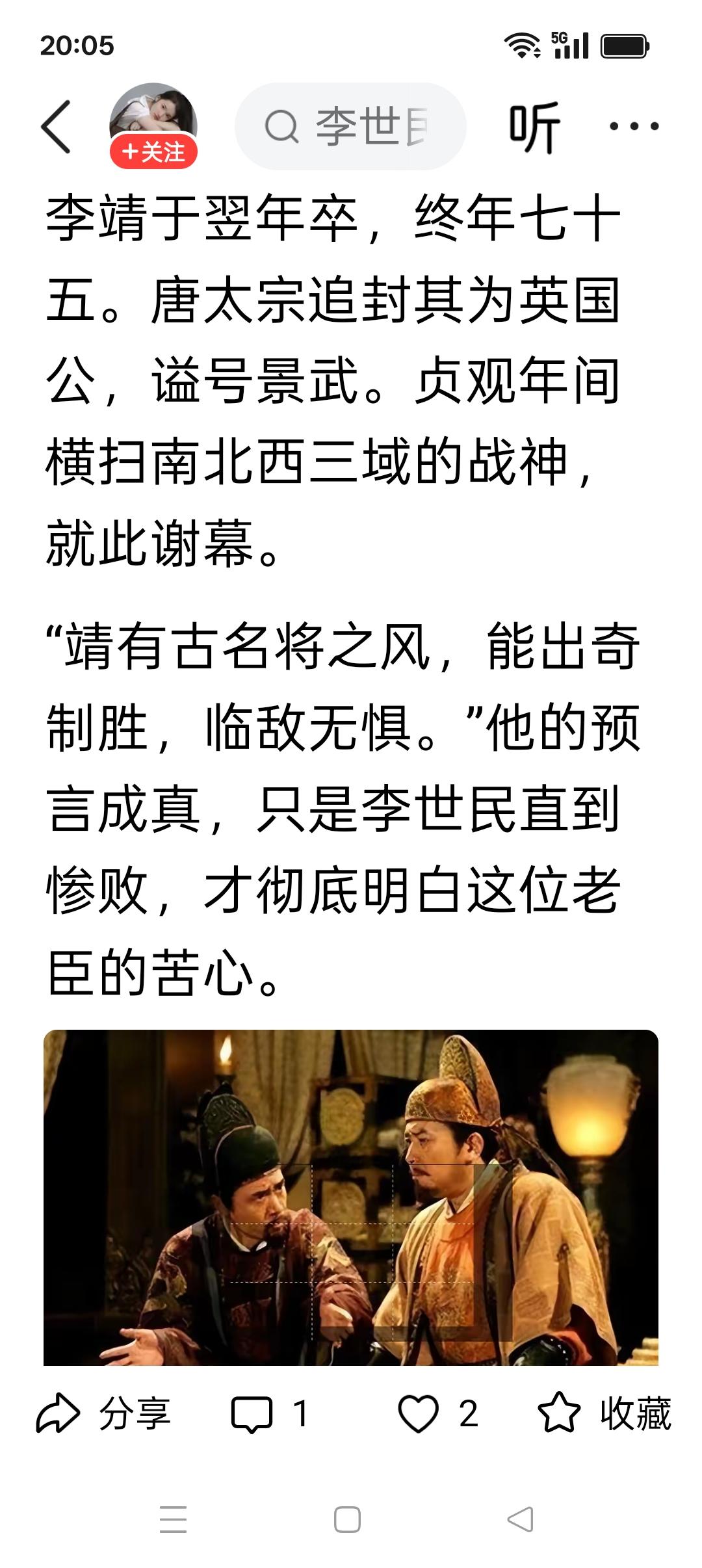 这位友友,写历史人物一定要严谨,李靖生于公元571年,逝世于公元649年,享年78岁,在世时先封代国公,后改封卫国公,逝世后追赠司徒,并州都督,谥号景武,陪葬昭陵。巧合的是李靖逝世8天后李世民也驾崩了。