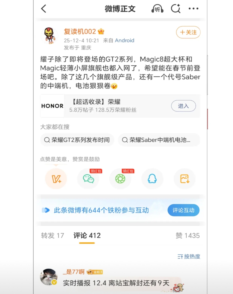 阿耀年底之前还有几款新机发布,都挺值得期待。 一个是主打性能的GT2系列,适合需要性能但追求性价比的用户。一个是Magic8系列的超大杯和轻薄小屏版。Magic8超大杯的亮点在于50MP的OV50R超大底主摄+2亿潜望长焦,以及业内唯一3D人脸+超声波指纹,还有120W+80W+7K大电池和双卫星通信。而小屏版则是天玑芯片,小屏党和天玑粉的福音。