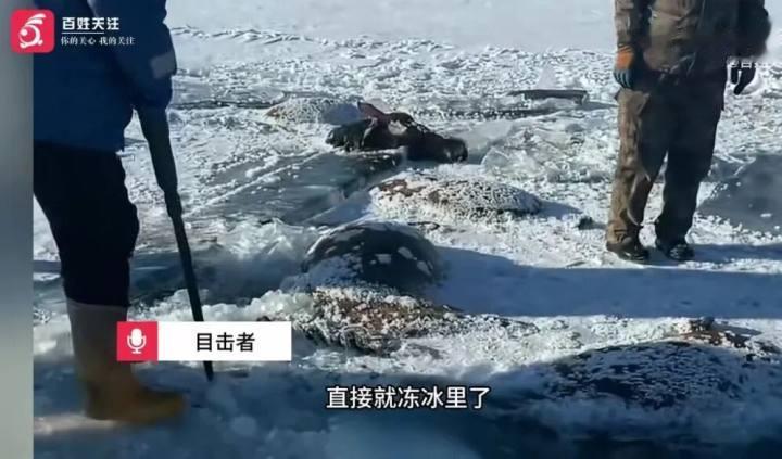 12月5日,黑龙江黑河嫩江市七星泡农场农户养殖的13匹马,被冻死在东风水库冰层中。目击者称,马匹扎堆喝水时冰面碎裂落水,马主人两天后才发现,在现场组织人员破冰打捞。