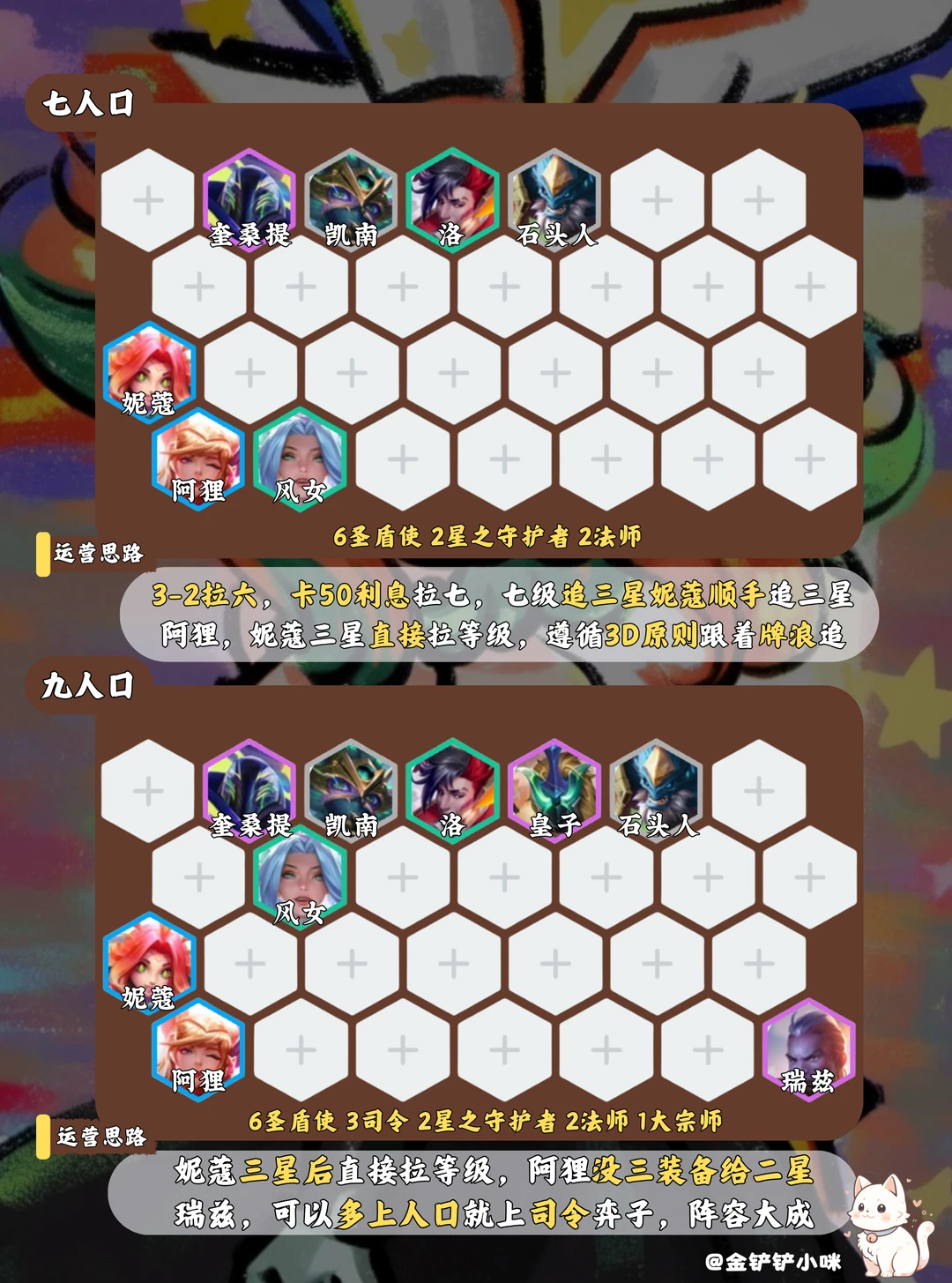 3️⃣阶段3-2拉6,卡50利息卡7,七级大D三星妮蔻,顺便追三星阿狸,妮蔻先三星直接拉等级,切记跟着牌浪D牌,遵循3D原则