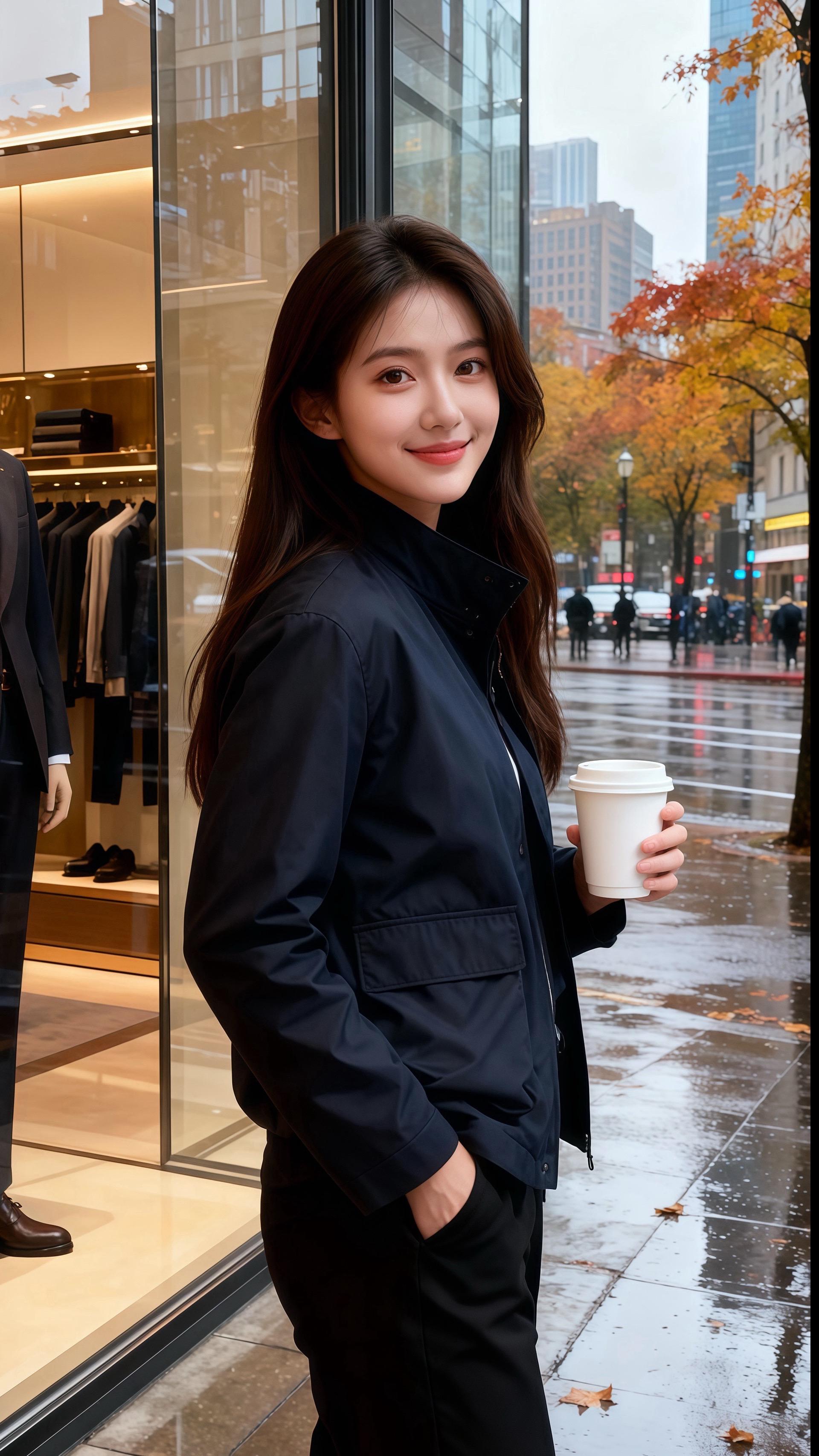 雨丝裹着桂香贴在橱窗时,许妍正倚着衣架抱杯热拿铁。她身上的藏青外套衬得秋意都软和——面料看着挺括却不硬,立领刚好贴住脖颈,口袋的版型利落,配着黑裤,松弛里裹着温温的质感。