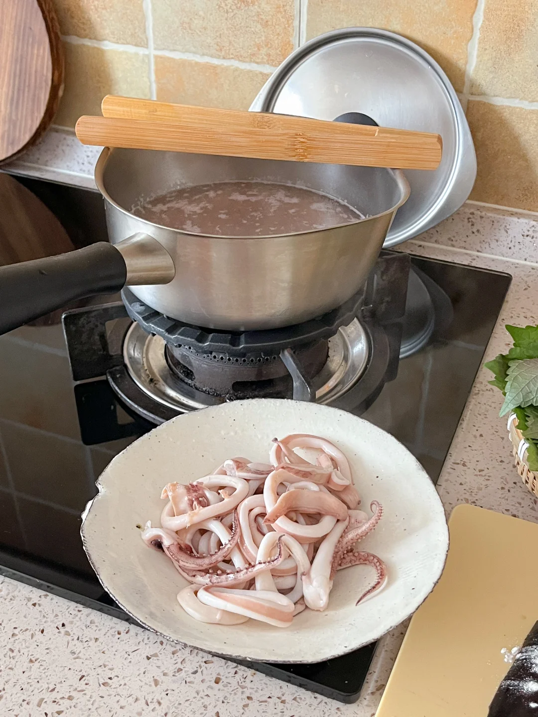 水开放入切好的鱿鱼 1-2分钟以后捞出来