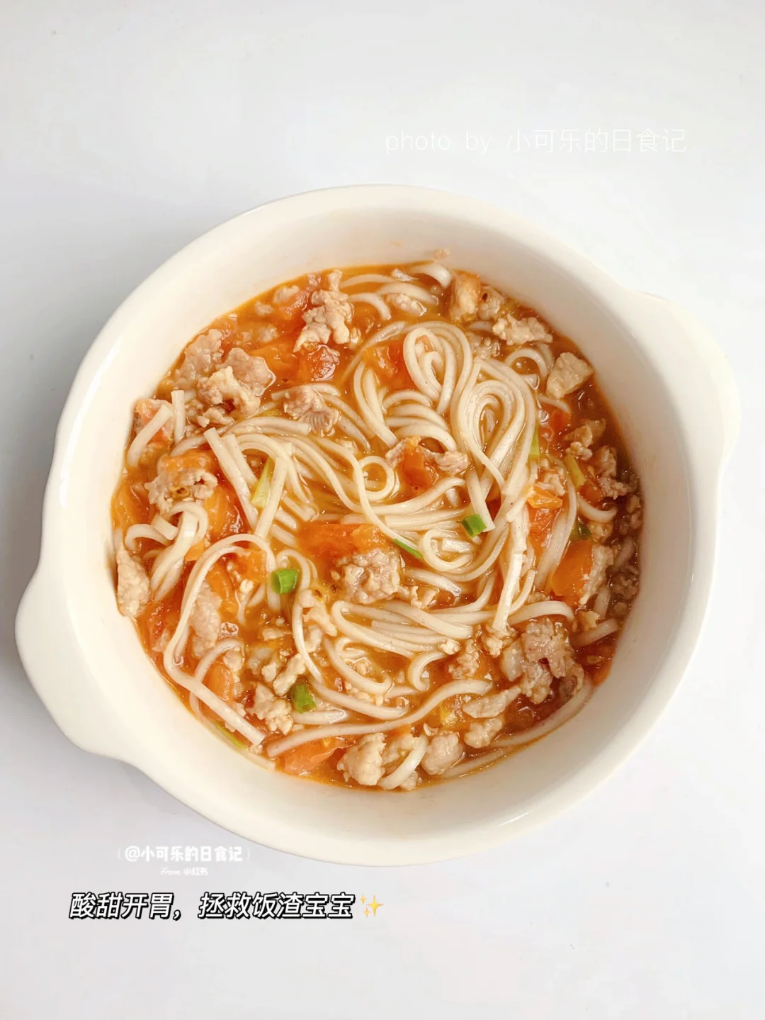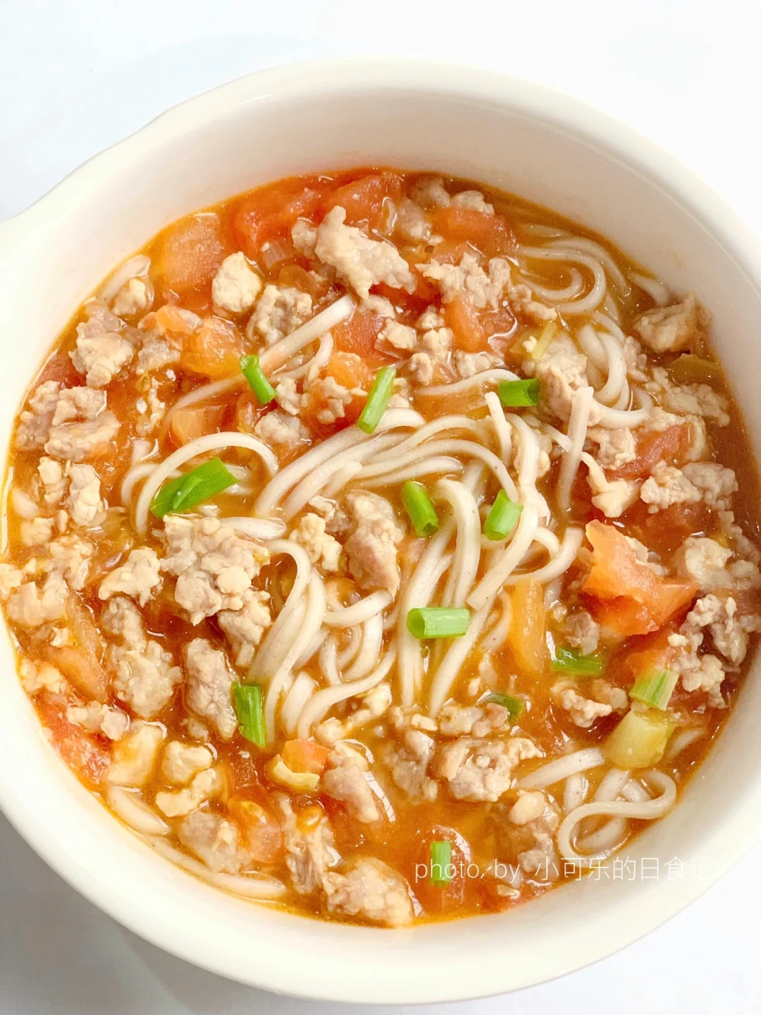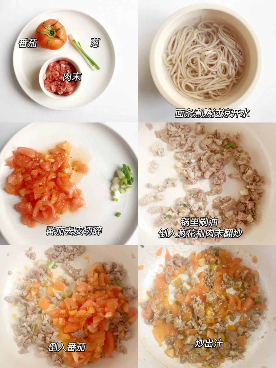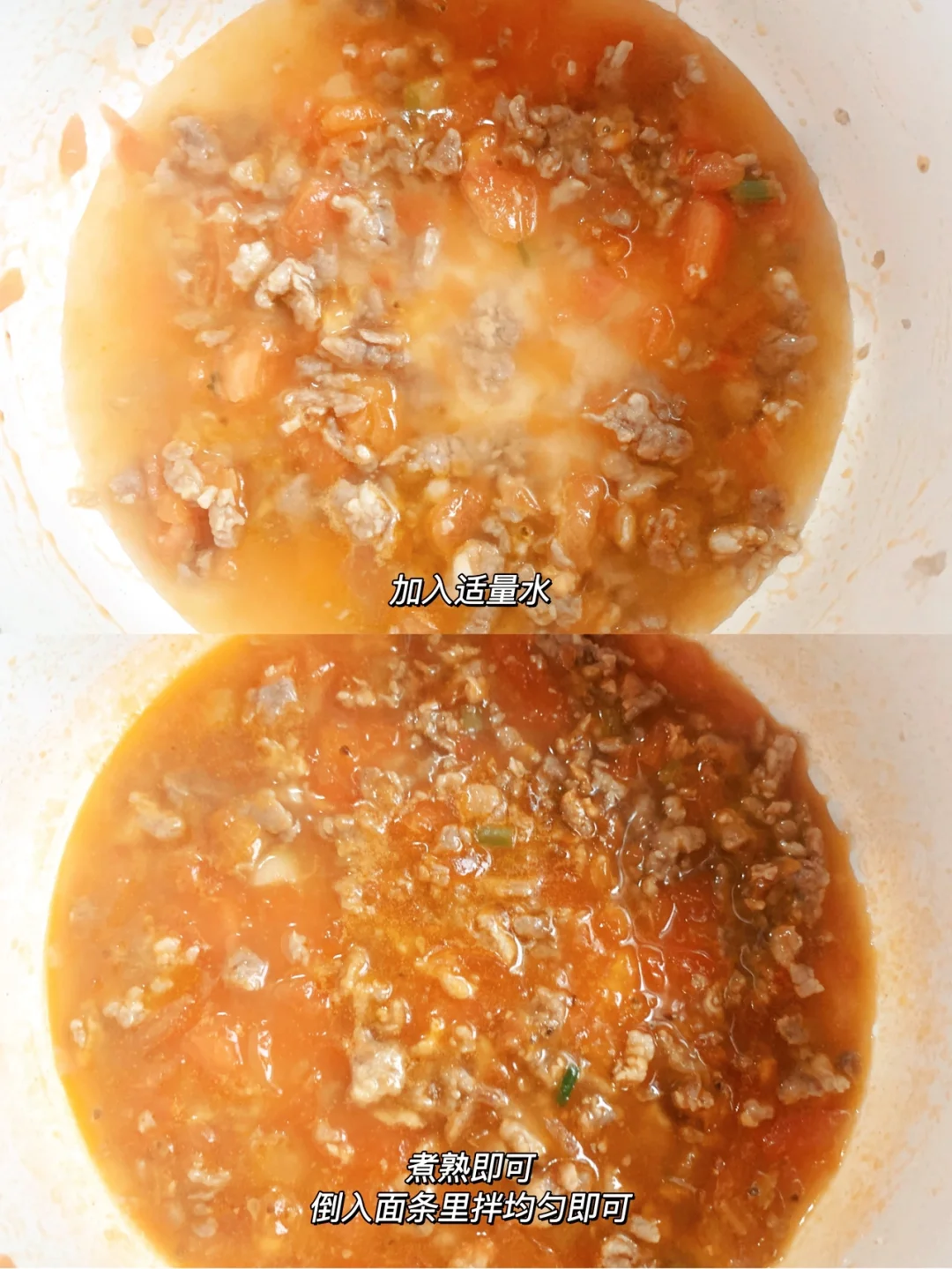 2⃣️锅里刷油,倒入肉末和葱花翻炒,加入番茄炒出汁,倒入适量清水煮至汤汁浓稠,加入面条拌均即可