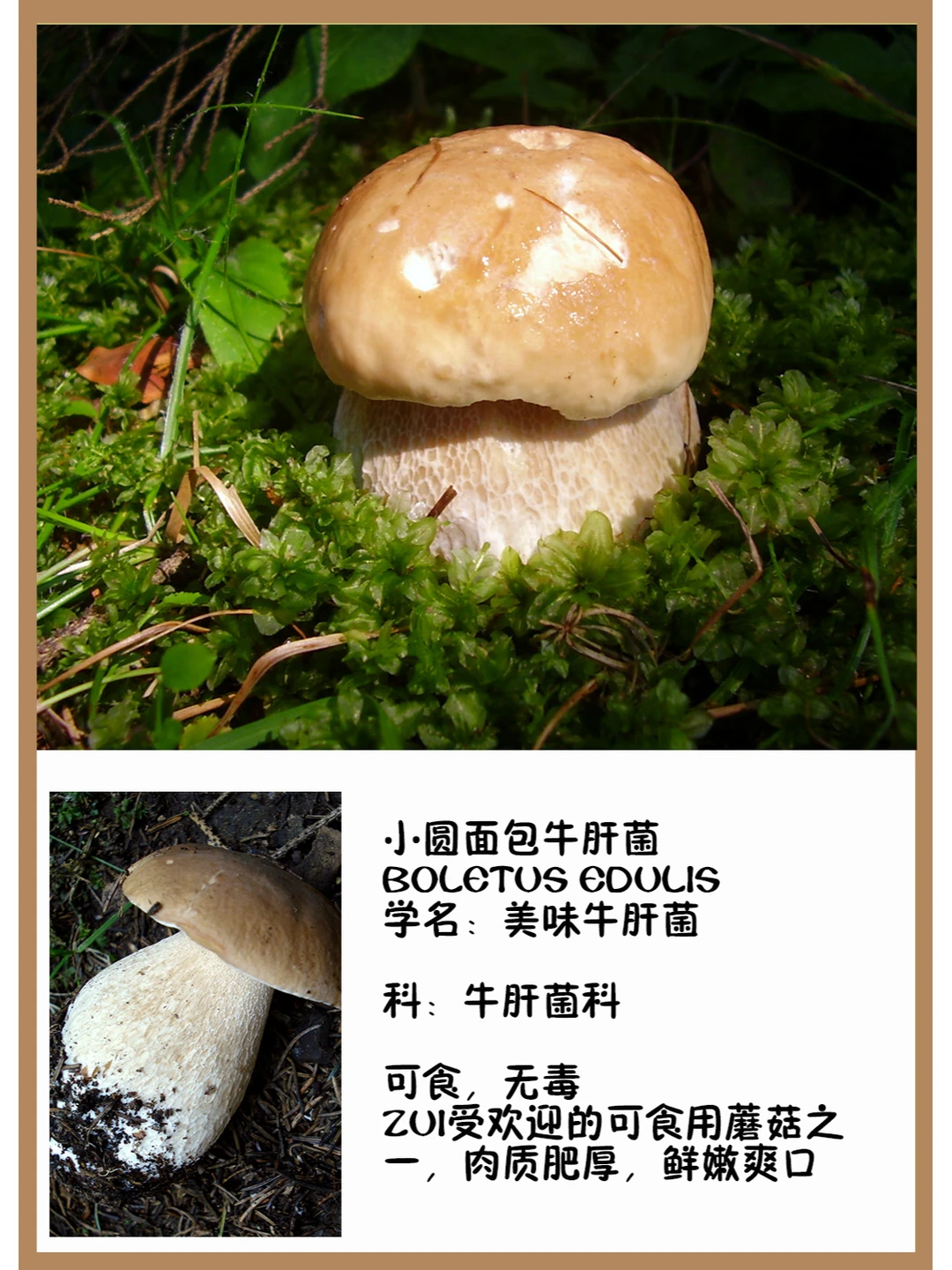 小圆面包牛肝菌 Boletus edulis 学名:美味牛肝菌 科:牛肝菌科 可食,无毒 zui受欢迎的可食用蘑菇之一,肉质肥厚,鲜嫩爽口 到了夏天,云南的美味牛肝菌最多也最便宜,每年我都会买上好多炸了吃,香死了~