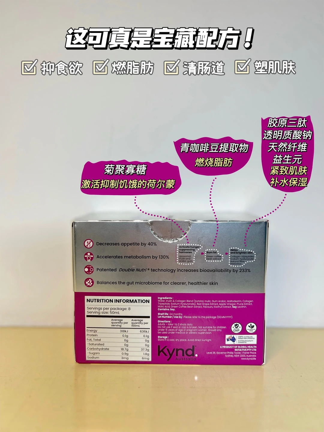 kynd纤体饮配料主要有:菊聚寡糖、青咖啡提取物、苹果醋、奇异果、西梅汁、胶原三肽、透明质酸钠,0糖0脂,简直是宝藏配方,随便拿出一个都很能打。