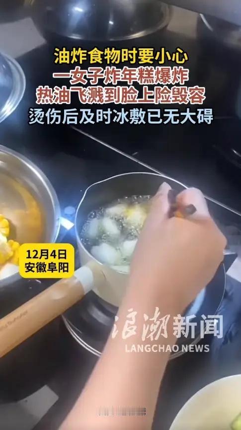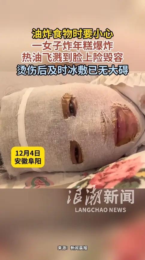 悲剧还是发生了!12月4日,安徽界首,一女子嘴馋想吃炸年糕,于是找出冰箱里的年糕,化了一天冻后放进锅里炸,没想到年糕突然爆开,滚烫的热油瞬间溅到女子脸上和手上!目前仍在治疗中。网友:应该是年糕里面水分太多。 女子事后回忆起来还心有余悸,那天早上她把年糕从冷冻室拿出来化冻,晚上想着炸一炸当零食。年糕一下油锅,热油就噼里啪啦四处飞溅,直接迸到她脸上和手上。 她还算冷静,马上用清水冲洗脸部,还找了冰块冷敷。因为处理得及时,脸上除了额头比较严重,其他地方没起太大水泡。她在接受采访时特意提醒大家,尽量不要油炸年糕,如果非要炸,一定做好防护。 网友看到她的分享后,纷纷留言说太危险了,不少人表示自己也“中过招”。有人说冷冻年糕内部容易存留水分或冰块,遇到高温热油,水分瞬间气化,体积急剧膨胀,就会在年糕内部产生大量蒸汽,一旦突破表层便可能引发爆裂甚至溅油。 其实像年糕、汤圆、木耳这类含水分较多的食物,油炸时很容易溅油甚至“爆炸”,被一些网友称为厨房“爆炸三绝”。之前黑龙江哈尔滨一位周女士在家炸元宵,元宵在快熟时突然爆炸,导致她面部二度烫伤。 想要安全享用油炸年糕,可以试试煎制或者空气炸锅。如果一定要油炸,可以借鉴一些烹饪建议:在年糕表面划几刀或扎小孔帮助排气。最关键的是,冷冻食品不要直接下油锅,并且要控制油温和数量,避免一次放入过多。 万一被热油溅到,立即用流动冷水持续冲洗伤处20-30分钟,不要乱涂牙膏、酱油等物品。这次事件中的女子就是处理得当,才减轻了伤害。 厨房里的每个细节都关系着安全,多一份小心就能少一份伤害。美食固然诱人,但平安更重要。 各位读者你们怎么看?欢迎在评论区讨论。