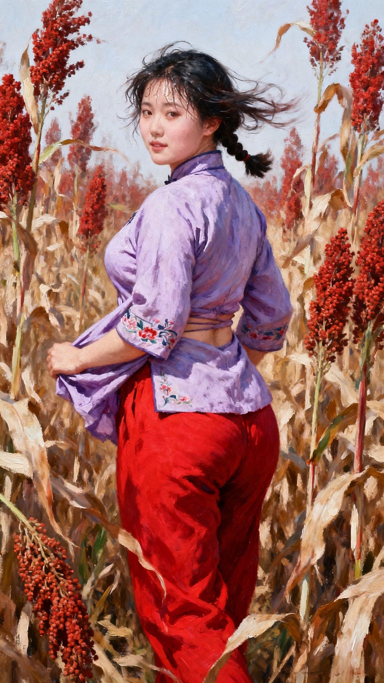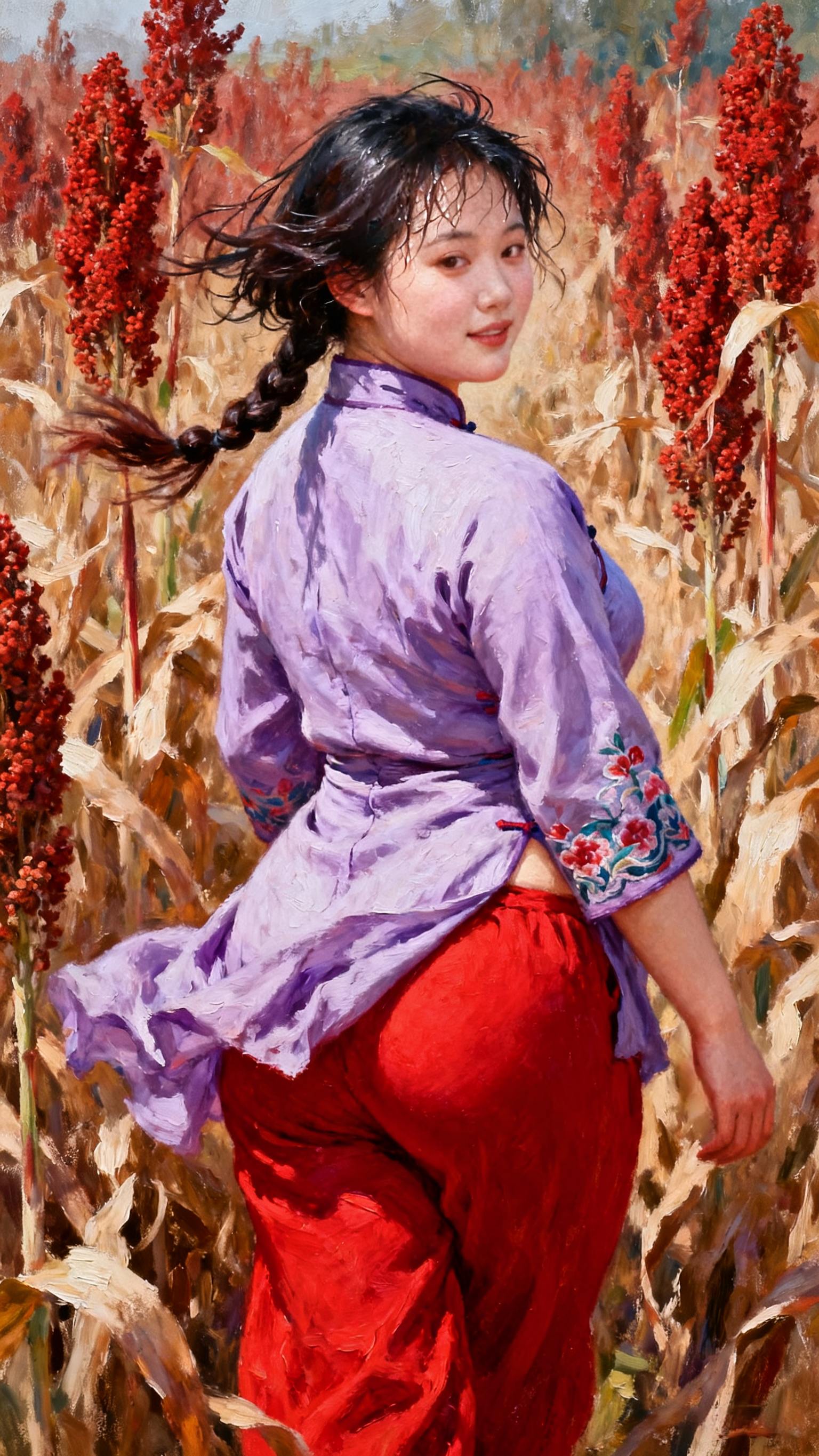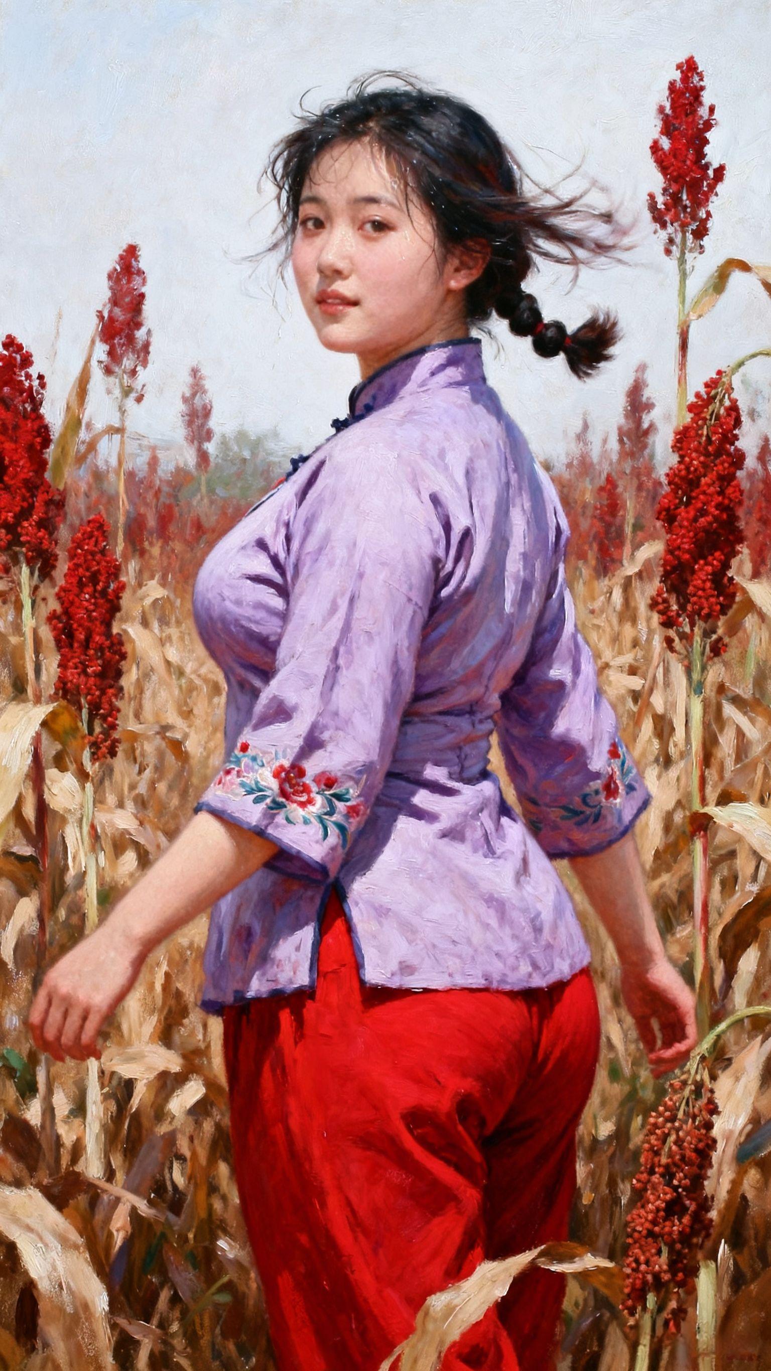 旗袍裹着荷风的柔,织锦花色与池间粉瓣相和。长发垂落时,笑意浸在夏的水汽里,比莲更