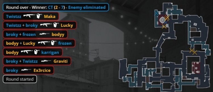 此后broky大狙开轰,第9回合守A开场双杀,转B后联手总监双人五杀,FaZe拿到第7分。