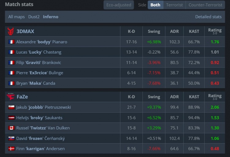 易边再战,jcobbb手枪局再轰四杀,大表哥次回合冲进香蕉道双杀后FaZe转A拿到第10分,3DMAX存钱让出第11分。来到长枪局,FaZe头铁三人带包打B,大表哥与jcobb佯攻A点被杀,3DMAX扳回一分。第17回合,FaZe强冲A点得手,jcobbb再轰三杀拿到赛点,最终3DMAX毫无还手之力,FaZe以13-5拿下图二,两图横扫淘汰3DMAX,FaZe进入2-2组准备地狱归来。