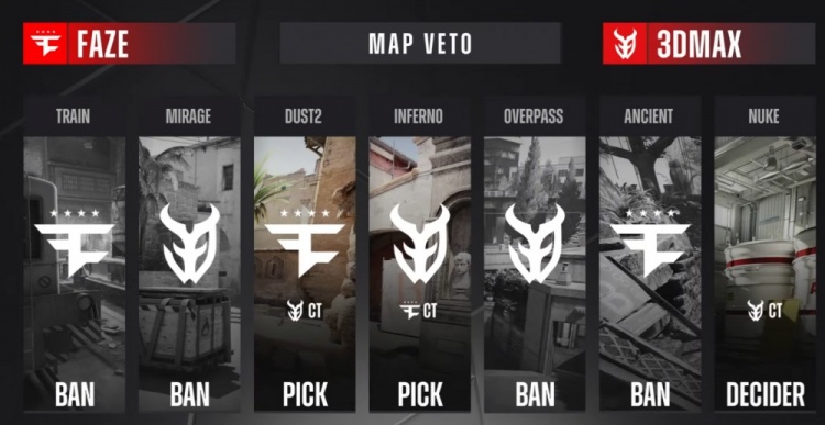 图一FaZe选图Dust2先攻,上半场手枪局Graviti在B近点三杀开轰,FaZe次回合半起未果,第3回合FaZe持续刚枪中门夹B,大表哥拿信息先被打掉,FaZe出中门后被3DMAX团灭,3DMAX连拿3分后,FaZe手枪翻盘拿到首分后趁热打铁连拿三分将比分扳平,broky第6回合AK+awp拿到三杀。