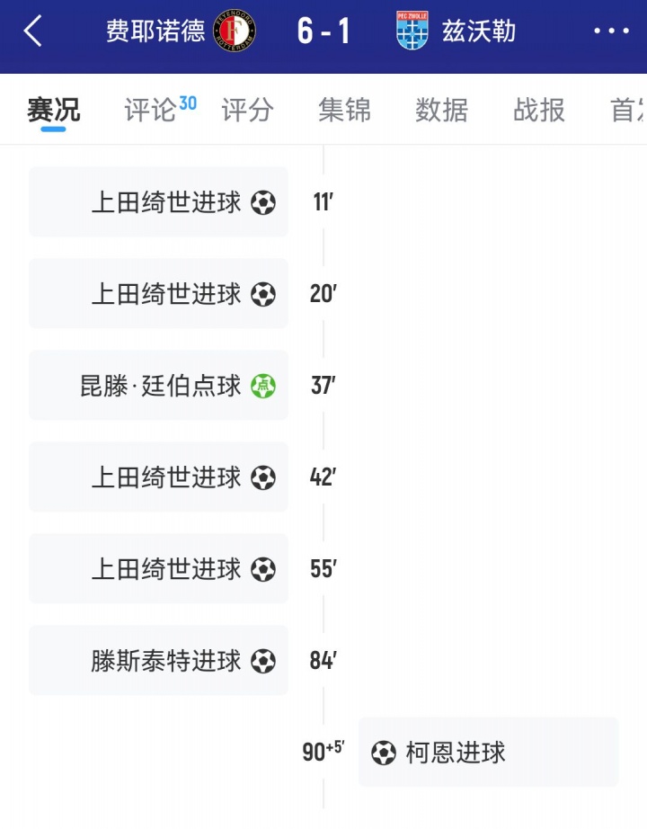 直播吧12月07日讯荷甲第15轮,费耶诺德主场6-1横扫兹沃勒,27岁的日本前锋上田绮世头顶脚踢上演大四喜,分别在比赛的第11、20、42、55分钟破门,帮助球队取得大胜。