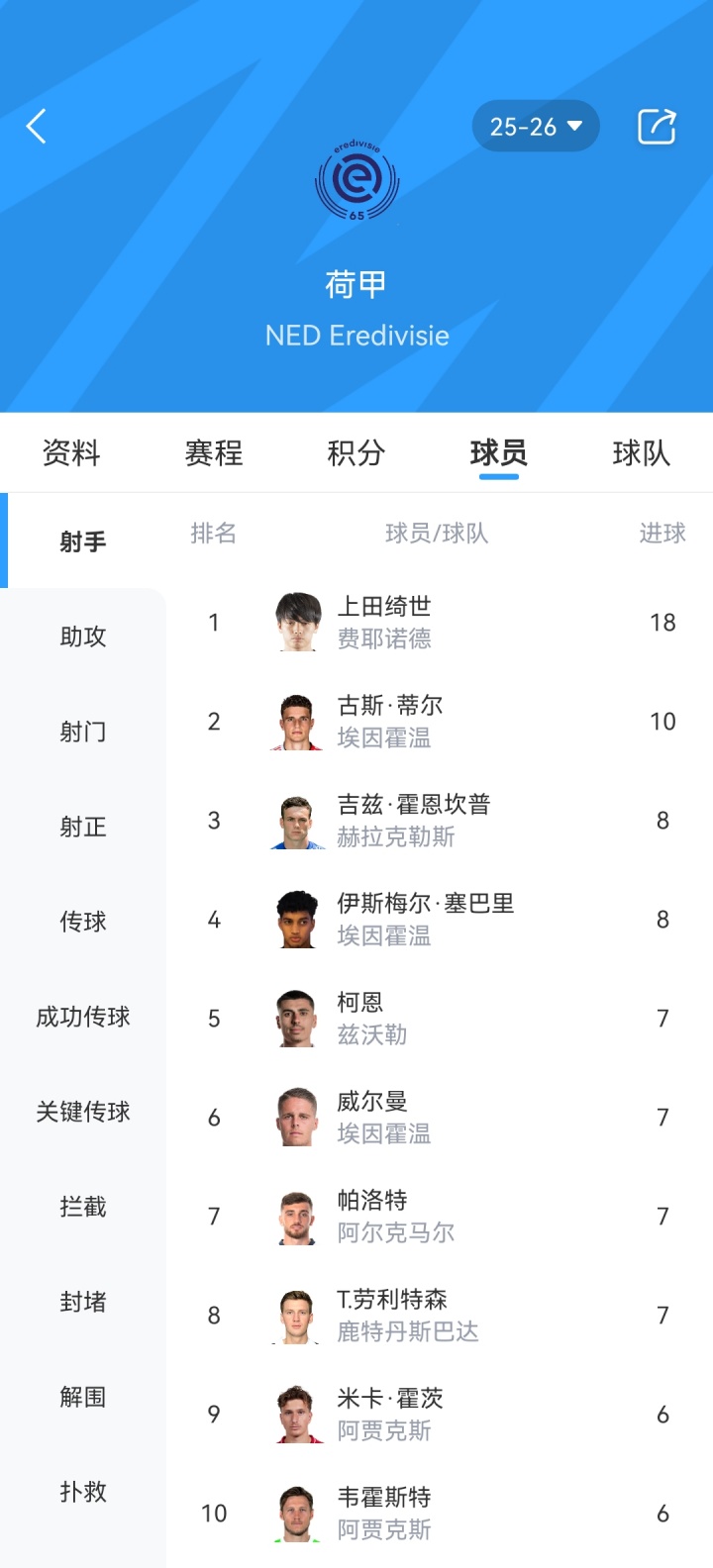 荷甲射手榜上,上田绮世目前以18个进球遥遥领先,与第二名之间有八个进球的差距;此外他个人的身价也来到1500万欧元,创造了个人新高。