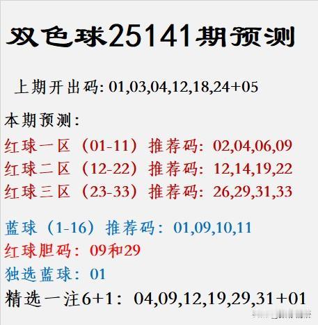 双色球25141期精准预测 上期开奖号码是:01,03,04,12 ,18, 24+ 05.全国开出4注一等奖,单注奖金998万多,其中湖北3注,四川一注,奖金还有26.9亿,祝大家好运! 本期走势前瞻: 红球一区(01-11)关注:02、04、06、09 红球二区(12-22)留意:12、14、19、22 红球三区(23-33)看好:26、29、31、33 蓝球(01-16)注意:01、09、10、11 红球倾向 09 和 29 作为胆码 蓝球单挑 01 综合挑选一注:04.09.12.19.29.31+01 温馨提示:理性投注快乐购彩!