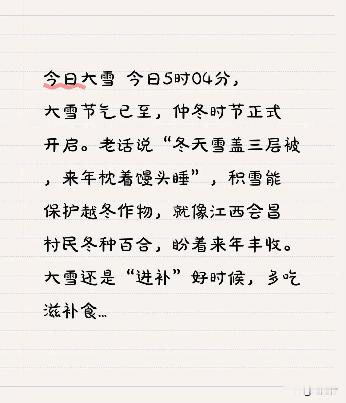 今日大雪 今日大雪 今日5时04分 大雪节气已至 仲冬时节开启 老话说 “冬天雪盖三层被,来年枕着馒头睡” 积雪能护越冬作物 如江西会昌村民冬种百合 盼着来年丰收 大雪是“进补”好时候 多吃滋补食物身体棒 江苏、甘肃、青海等地 有“大雪腌肉”习俗 出太阳时 屋檐下晾晒的腌货 是生活的烟火气 恰逢周末 约上朋友闲坐煮茶 等一场瑞雪 感受雪的平静 想想都美 你最想和谁一起赏雪呢? 大雪 大雪节气 大雪暴雪天气 降雪量预报