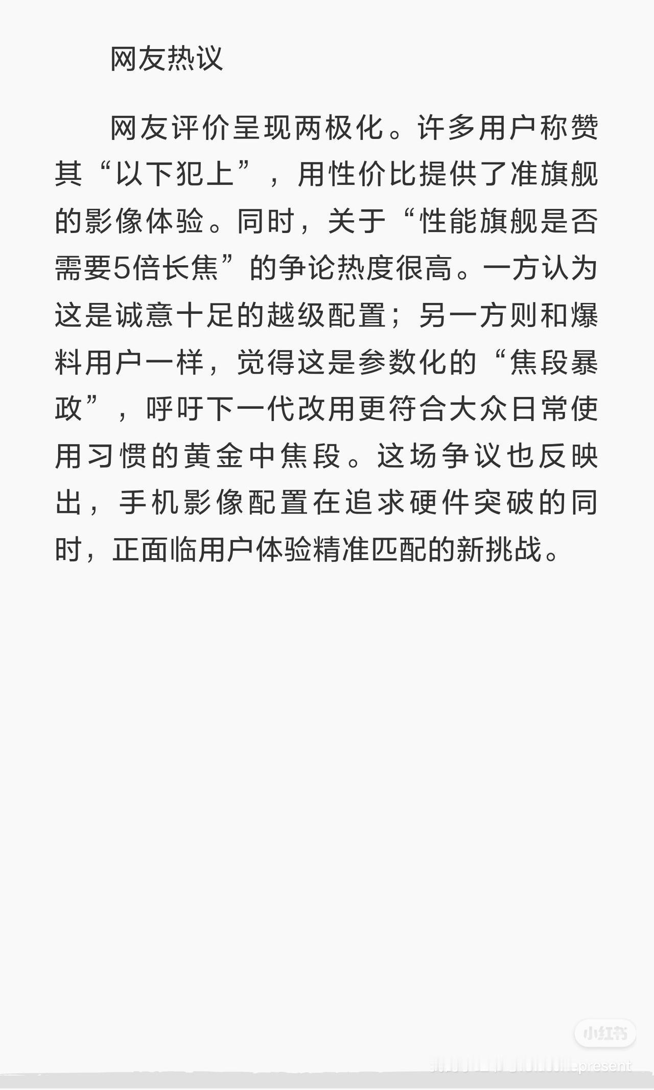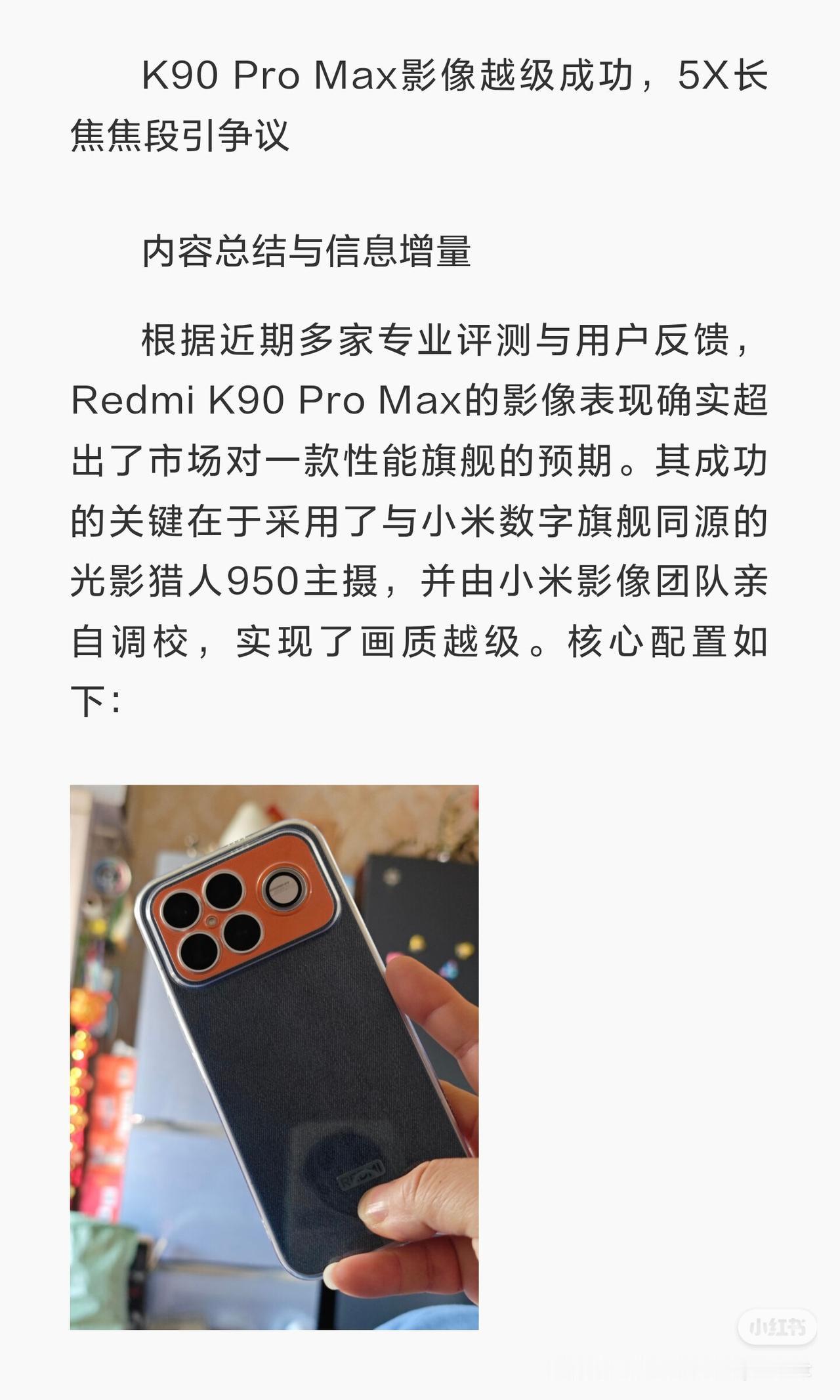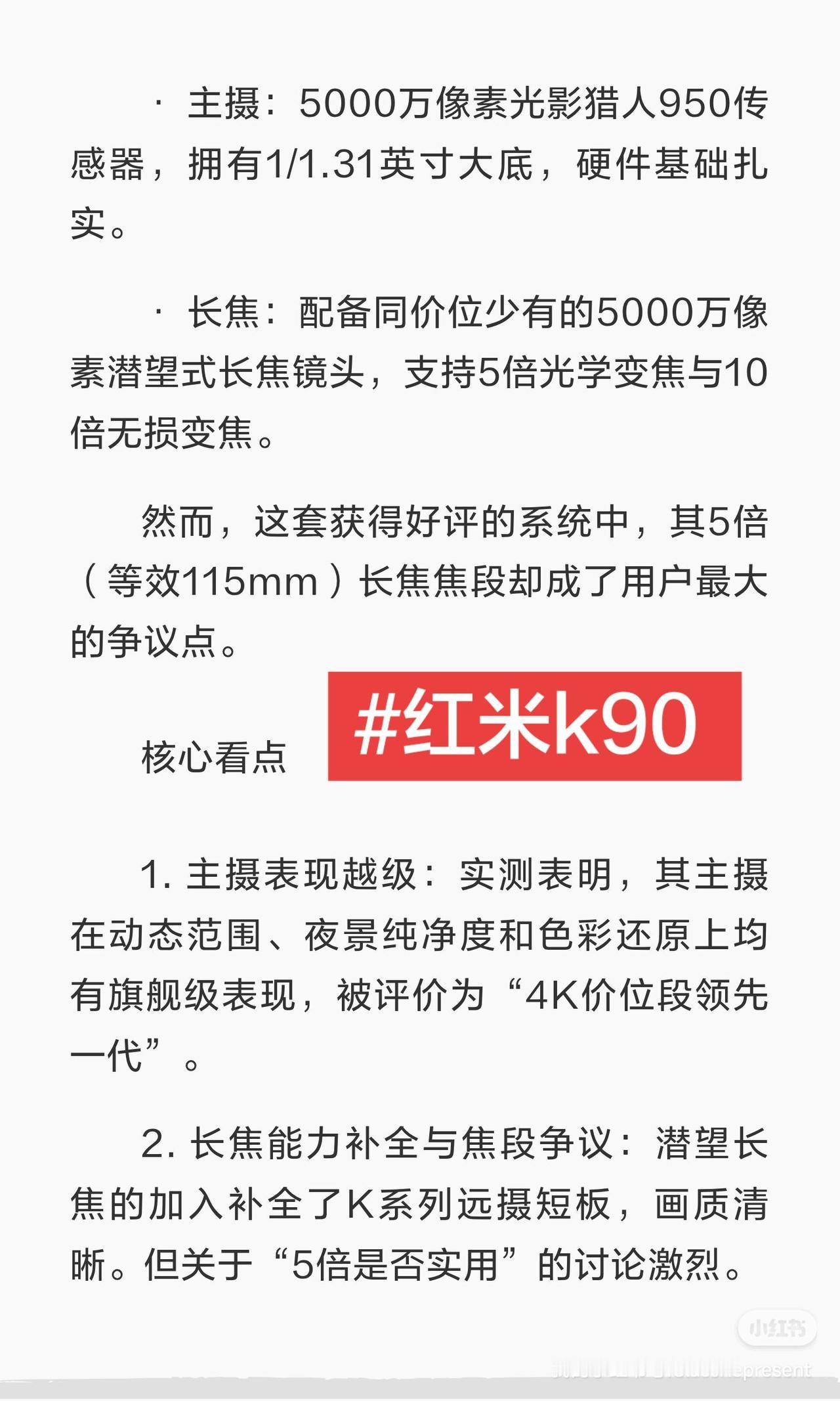 K90 Pro Max影像越级成功,5X长焦焦段引争议 内容总结与信息增量 根据近期多家专业评测与用户反馈,Redmi K90 Pro Max的影像表现确实超出了市场对一款性能旗舰的预期。其成功的关键在于采用了与小米数字旗舰同源的光影猎人950主摄,并由小米影像团队亲自调校,实现了画质越级。核心配置如下: · 主摄:5000万像素光影猎人950传感器,拥有1/1.31英寸大底,硬件基础扎实。 · 长焦:配备同价位少有的5000万像素潜望式长焦镜头,支持5倍光学变焦与10倍无损变焦。 然而,这套获得好评的系统中,其5倍(等效115mm)长焦焦段却成了用户最大的争议点。 核心看点 1. 主摄表现越级:实测表明,其主摄在动态范围、夜景纯净度和色彩还原上均有旗舰级表现,被评价为“4K价位段领先一代”。 2. 长焦能力补全与焦段争议:潜望长焦的加入补全了K系列远摄短板,画质清晰。但关于“5倍是否实用”的讨论激烈。支持者认为主摄画质好,2-3倍数码变焦已足够,5倍能提供更独特的远摄视角。反对者(如用户所言)则认为该焦段尴尬,日常使用率低,期待更实用的3倍左右焦段。 网友热议 网友评价呈现两极化。许多用户称赞其“以下犯上”,用性价比提供了准旗舰的影像体验。同时,关于“性能旗舰是否需要5倍长焦”的争论热度很高。一方认为这是诚意十足的越级配置;另一方则和爆料用户一样,觉得这是参数化的“焦段暴政”,呼吁下一代改用更符合大众日常使用习惯的黄金中焦段。这场争议也反映出,手机影像配置在追求硬件突破的同时,正面临用户体验精准匹配的新挑战。