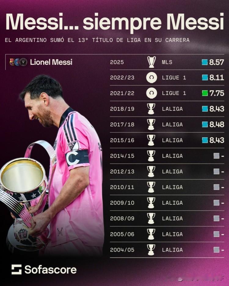 48冠!梅西应该是全世界冠军拿的最多的人吧?要是明年再拿一个美冠杯,一个世界杯,加起来正好五十冠了。 谁能想到梅西去了美国把美职联的冠军拿遍了?第一年冠军杯,第二年支持者盾杯,第三年总冠军杯。没谁了。 从梅西去美国那的这三个冠军的含金量来看,美职联的冠军有些似是而非,支持者盾应该也算是联赛冠军,美职联季后赛冠军也算是联赛冠军,相比季后赛冠军可能更重要一点,下赛季冲击美冠杯吧,俱乐部的荣誉就缺这个了。 话说梅西职业生涯有机会但还没拿到的只剩法国杯和中北美冠军联赛冠军了吧?别的该拿的都拿过了。