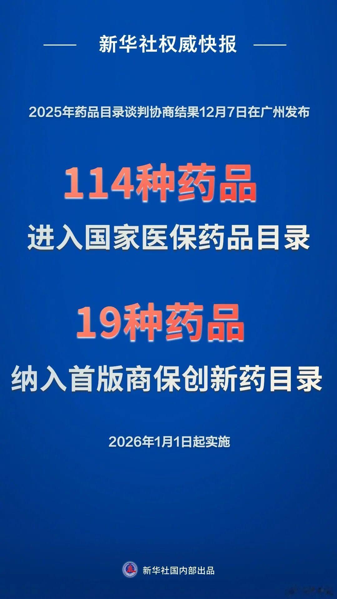据新华社消息,记者12月7日从国家医保局获悉,2025年国家医保药品目录及首版商保创新药目录在广州发布。2025年国家医保药品目录成功新增114种药品,有50种是一类创新药,总体成功率88%,较2024年的76%明显提高。19种药品纳入首版商保创新药目录。