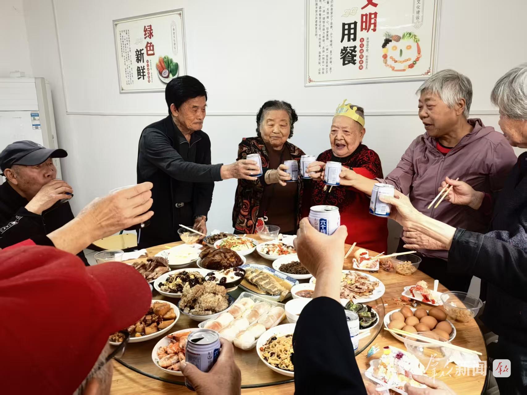 江南小区居民93岁的原素琴,在社区共享厨房就餐区过生日的场景。