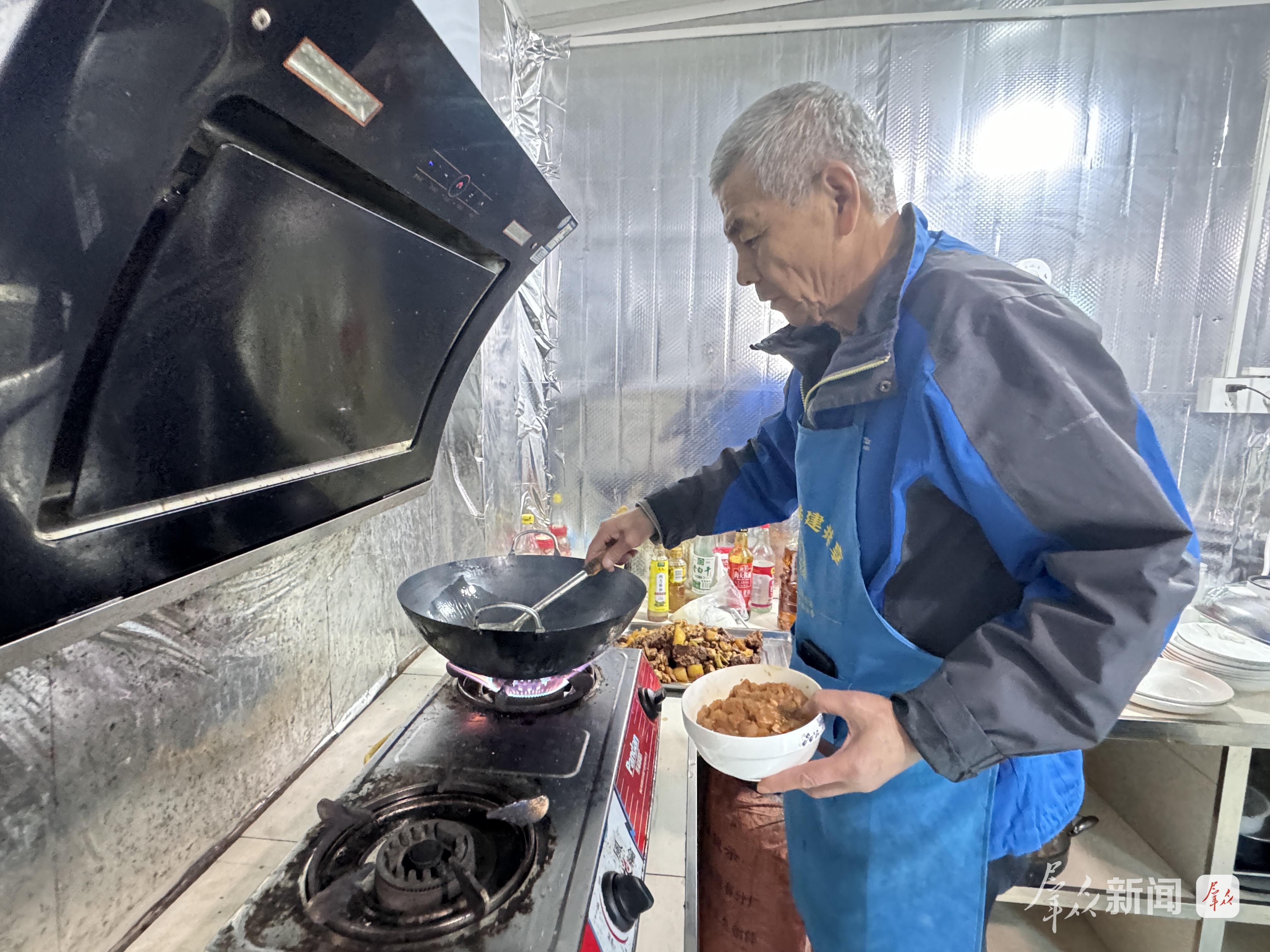 73岁的张玉玺执勺而立,手腕轻抖,菜影翻飞。几位邻居在一旁递碟传菜,默契十足。“真没想到,老了还能在这儿当大厨。”这位老炊事员的话语中透着欣慰。