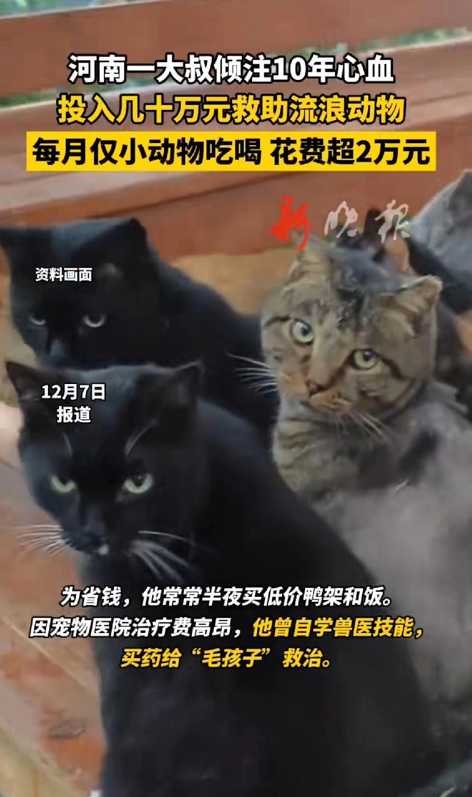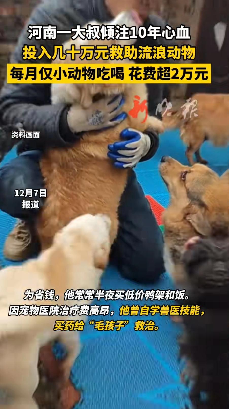 河南郑州一大叔倾注10年心血,投入几十万建立流浪动物救助基地。 目前收治200多条流浪狗,100只流浪猫。 每月仅小动物吃喝,花费超2万。 这大叔费尽心血,照顾这些猫狗。 这些毛孩子每次生病,去宠物医院救治花费巨大。 为了节省费用,大叔自学兽医技能,自己买药给这些小动物治病。 这位大叔真是大爱无私,光照顾这些小动物们的吃喝拉撒,就够费时费力的了,每月巨大的开销也不是一般人能承受的了。流浪动物救助 流浪动物收养 助养流浪狗 流浪猫狗救援 流浪猫救治中心 流浪宠物基地