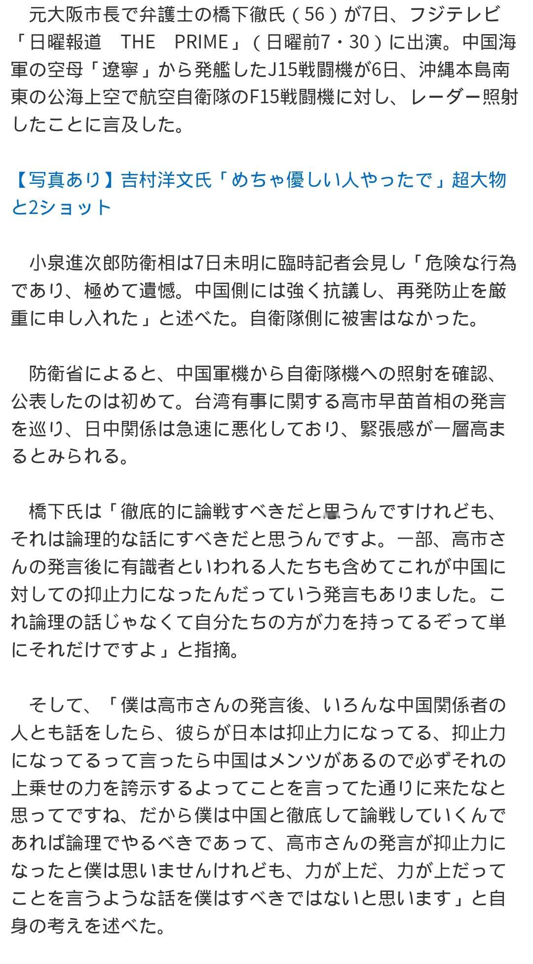 桥下彻就F-15被雷达照表态! 极右翼维新会创始人桥下彻说: “……我认为应该进行彻底的论战,但这应该是逻辑层面的讨论。在高市女士发言后,包括部分被称为专家的人士在内,出现了认为这(发言)成为对华威慑力的言论。这并非逻辑上的讨论,而仅仅是(在宣称)‘我们拥有更强的力量’而已。” 他接着说,“在高市女士发言后,我与多位中国相关人士进行了交流,他们曾表示‘如果日本说这形成了威慑力,因为有面子问题,中国必定会展示更强的力量来加码’。事情正如他们所说的那样发生了。所以,我认为如果要与中国彻底论战,应该基于逻辑来进行。我个人不认为高市女士的发言形成了威慑力,但我觉得不应该说那种只是宣扬‘我们力量更强、我们力量更强’的话。” 桥下彻的潜台词是:日本没有那个实力,就不应该用“力量展示”来与中国对抗,而应该用逻辑和理性来论战。可是日本国内已经不允许有理性讨论的空间。这样做,非但无法对中形成所谓的“威慑力”,反而刺激中国采取更强硬的军事行动作为回应,最终让日本陷入被动。 简单说就是:“你挑衅在先,就别怪别人反击。现在被反制了,就别装受害者。” 桥下彻与垂秀夫这类“务实派”强硬人物,与高市早苗等“冒进派”的区别,不在于最终目标(制衡中国),而在于当前策略的,所以我们务实清醒看待! Source: X