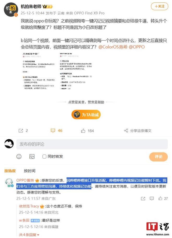 IT之家12月7日消息,博主@机拍朱老师在12月5日发文反馈,称OPPO一键闪记记视频摘要和总结功能更新后没有以前好用,B站同一个视频,前面一键闪记可以精确到每一个时间点讲什么,更新之后直接只会总结页面内容,视频里的详细内容没了。