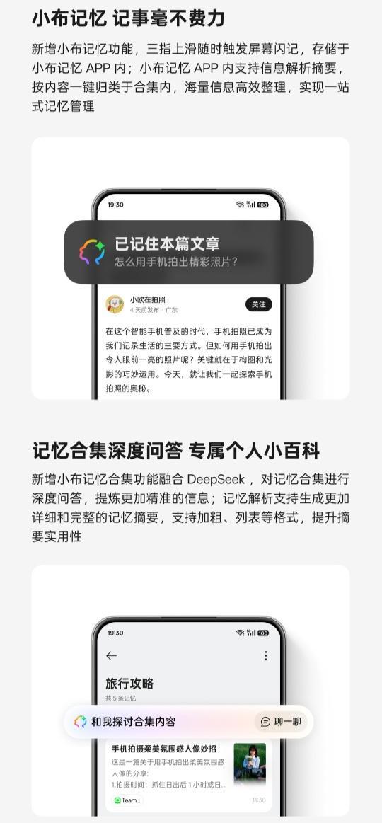 据介绍,小布记忆App内支持信息解析摘要,按内容一键归类于合集内,实现一站式记忆管理。同时,小布记忆合集功能融合DeepSeek,支持对记忆合集进行深度问答,提炼更加精准的信息;记忆解析支持生成更加详细和完整的记忆摘要,支持加粗、列表等格式。