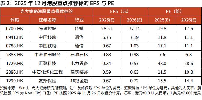 12月券商金股组合(4) 各家券商每月初对外披露的十大金股,高度汇集了分析师的研究精华,融合了风格选择、行业配置、选股择时等多维度的研究观点,长期以来受到市场的热烈关注。12月争取多给大家分享几篇,作为大家资产配置的参考,今天带来第四篇-光大证券12月金股。 报告指出,A股市场仍处牛市但短期或进入宽幅震荡阶段,短期(报告发布11月末)建议关注高股息防御板块(如银行、公用事业)及受益于内需政策的消费板块;中期继续看好TMT与先进制造主线。港股方面,在美联储降息预期与AI产业趋势下,建议采取“哑铃”型配置,兼顾科技成长(自主可控、芯片、高端制造)和高股息低波动板块(通信、公用事业等)。报告同步推出12月A股金股组合10只、港股金股组合7只,以反映上述配置思路。