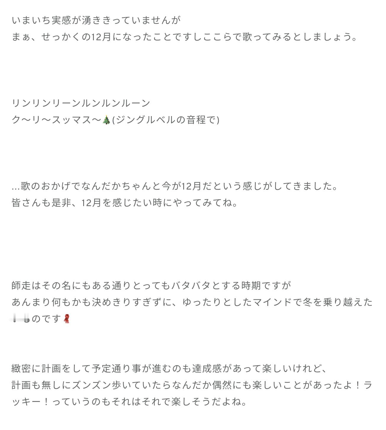 ひなの「いつの間に12月になっていたのでしょう。いや、自分でもしっかり「12月」とブログやグリーティングカードに書いてたし、お部屋もクリスマス色になってきましたけど…かみむらは、もう2025年も12月だという衝撃的な事実を今の今まで本当の意味で理解できていなかったのです…!改めてびっくりしています。そっか、あと1ヶ月も経たずに今年が終わっちゃうのかぁ。それってもしかして、もうすぐ2026年がやってくるってことですか?本当かなぁ。本当か!」