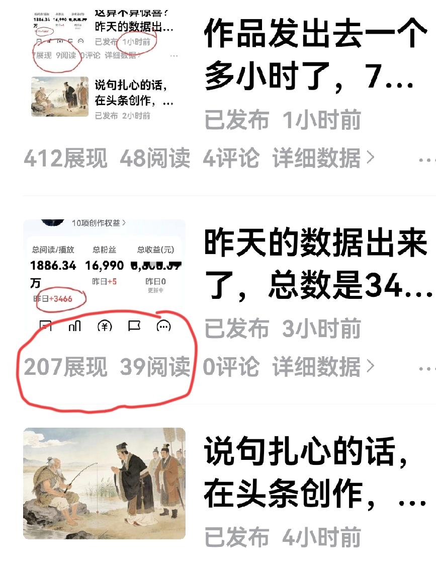 刚才错怪了头条!但头条是大格局,并没有责怪我!不过这次的经历是一个大教训,以后的创作中绝不会再犯! 事情的起因是这样的!我的一篇微文发表后,一个多小时后,展现量仅仅只有7个,虽然阅读量是9个,但头条就是卡着流量不放,一直就是那7个展现量摆在那里,一摆就是一个多小时,就因为这,我写了另一篇微文,表达了对头条的不满,不过这次发布新作品的时候,我也留了一个心眼。 我感觉被严重限流的那篇微文一定是哪里出现了差错,与账号无关,于是我顺便对微文的开头进行了改动,将前面的几字删除了,试试我的判断有没有错? 果然我的估计没有错,微文被严重限流就是因为开头的那几个字造成的,因为删除了那几个字后,头条突然就开始推流了,至现在,其展现象已经有了207,阅读量30,有两个点赞了。 微文的开头是6个字,我是这样开头的,这算不算惊喜?昨天的数据出来了,总数是3466。 多写了6个字被头限流,这几个字一定是被头条判为了标题党,让读者误认为我昨天的收益是3466,而后面的内容却并不是这样,3466是昨天的阅读量! 看来头条对标题党的处罚是非常严格的,它已经成为了机器人限流的一种算法。 吃一堑长一智,这样的错误我以后不会再犯,也希望通过这次教训能够对友友们有所帮助。