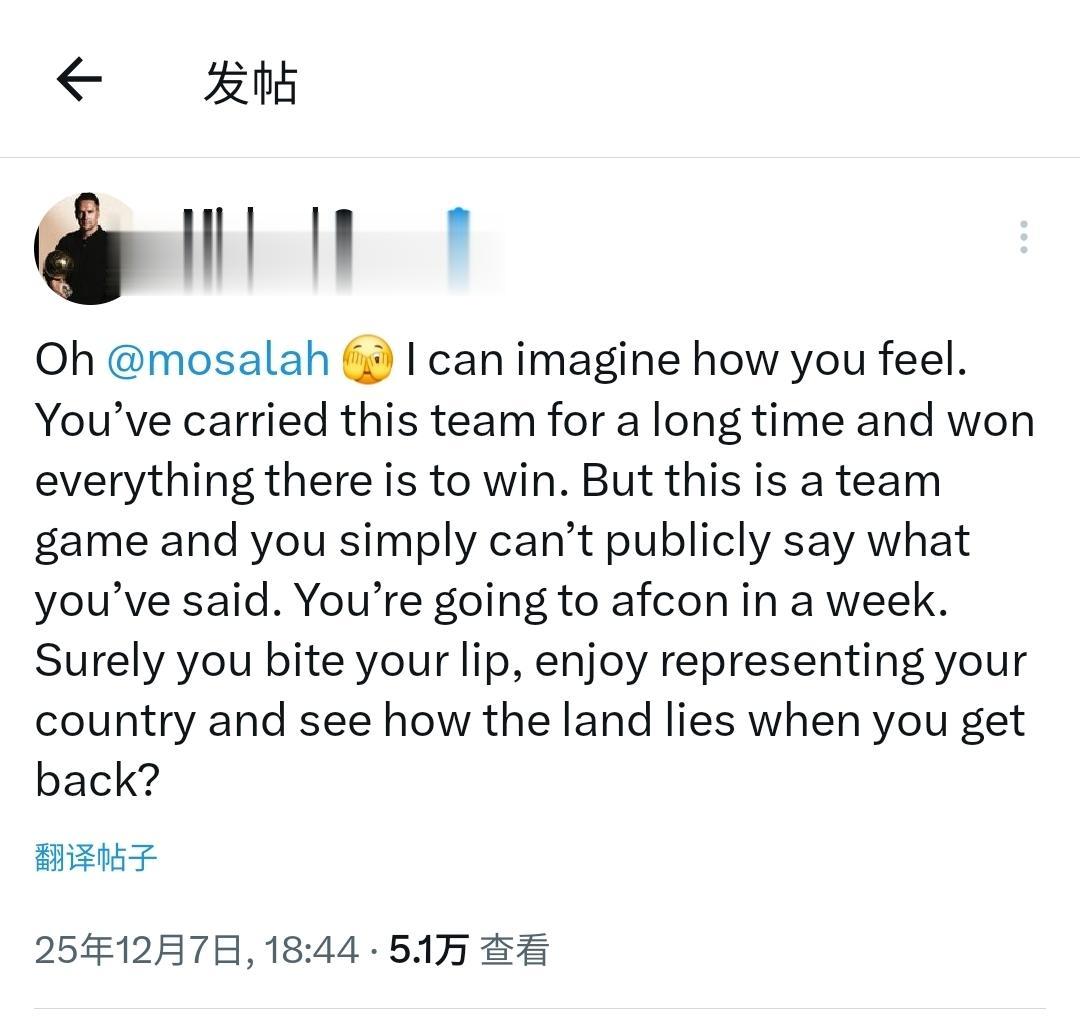 欧文写道:“哦,萨拉赫,我能想象你现在的感受。长久以来你一直带领着这支球队前行,赢得了所有能赢的荣誉。但这是团队运动,你实在不该公开说出那样的话。一周后你就要去参加非洲杯了。此刻你难道不该先保持沉默,享受代表国家的荣耀,等归来后再静观局势吗?”